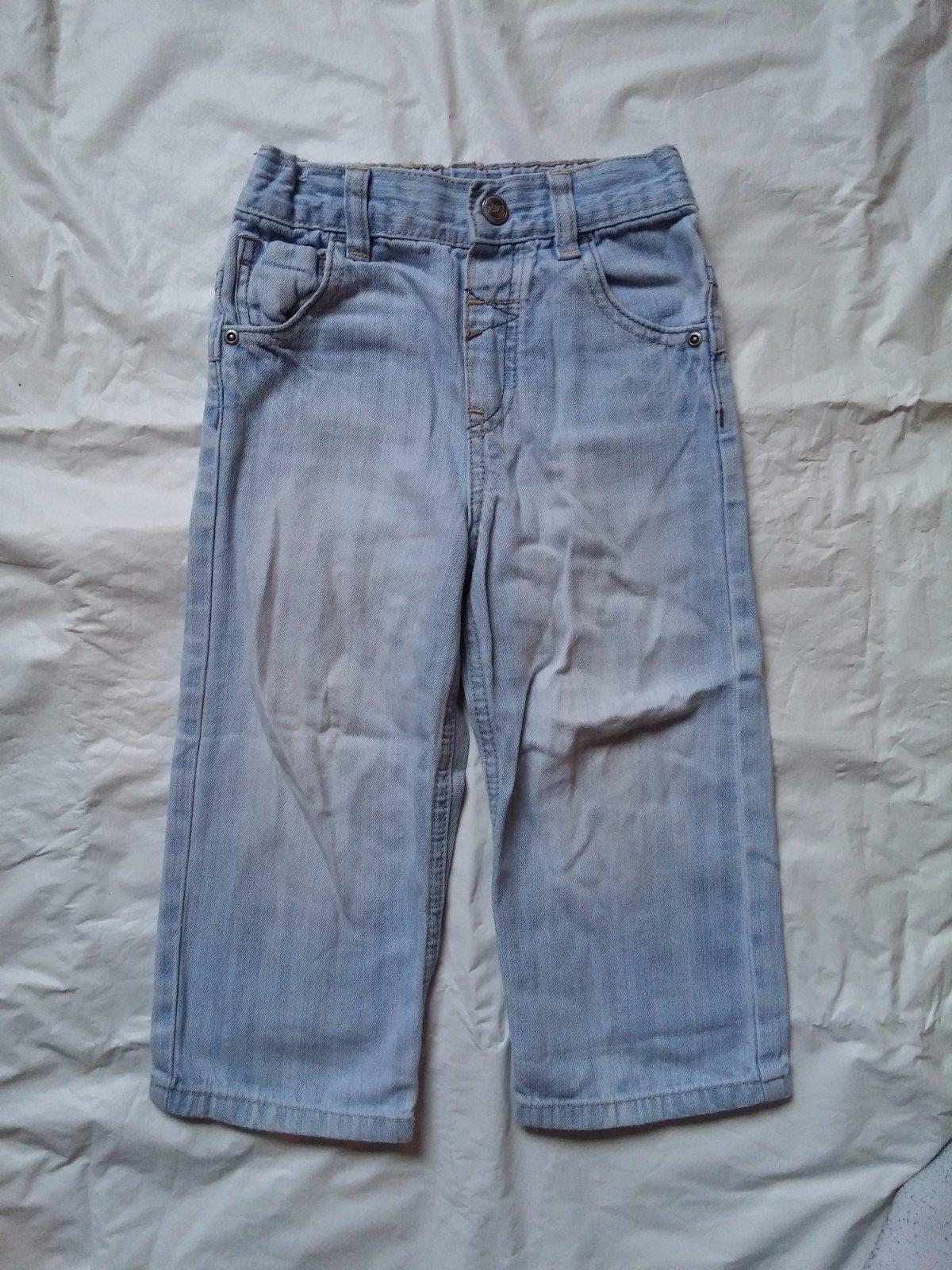 Nošené světle modré džíny, rifle pro chlapečka zn. Next. Džíny jsou nošené, vzadu dole nohavice trochu rozdrblé a tenčí látka na kolínkách, ale klidně i na parádu budou ještě dobré. Jinak bez vad. Džíny jsou z lehké džínoviny, moc příjemné. Vel. uvedena 92, ale přijdou mi větší, dávám do 98