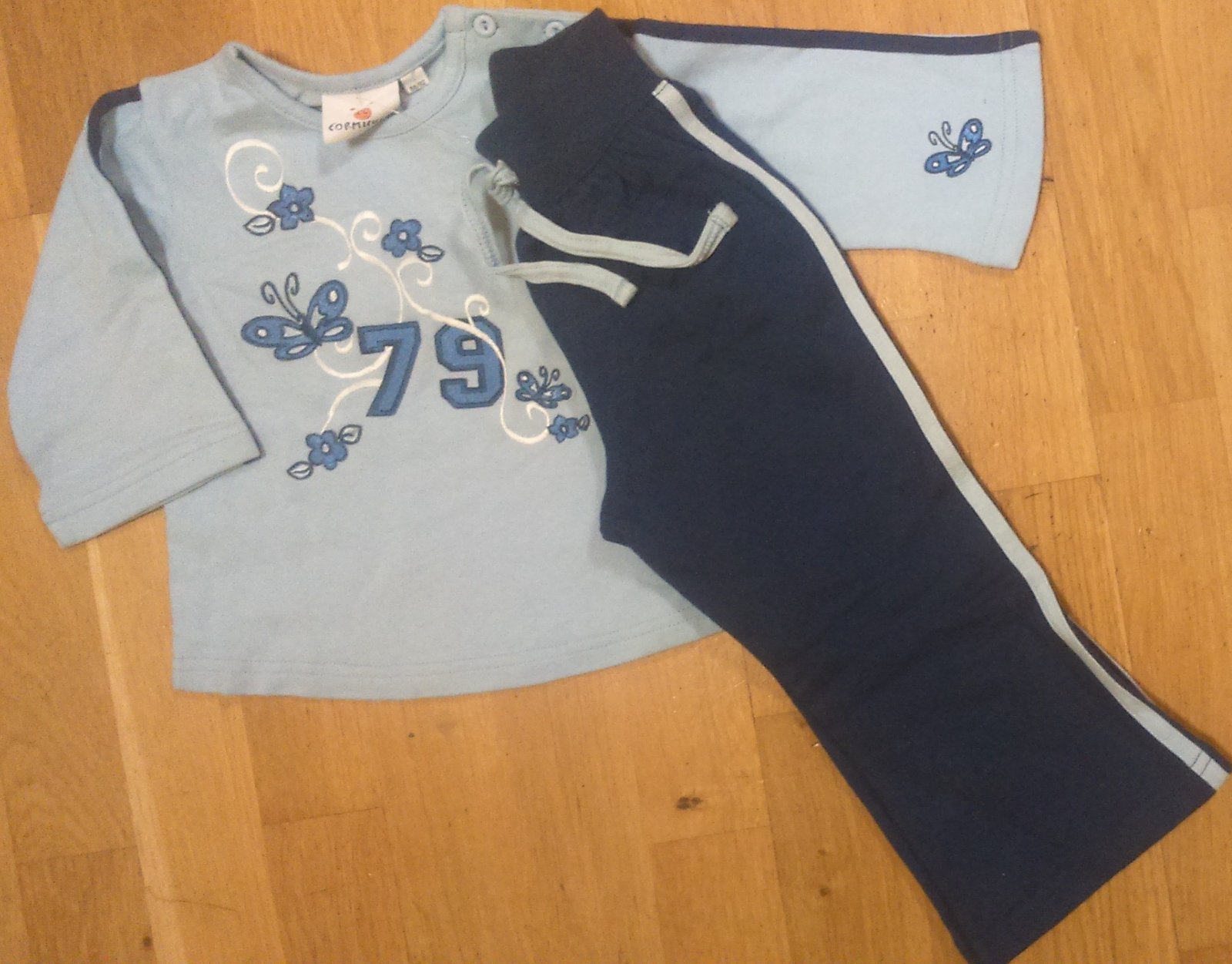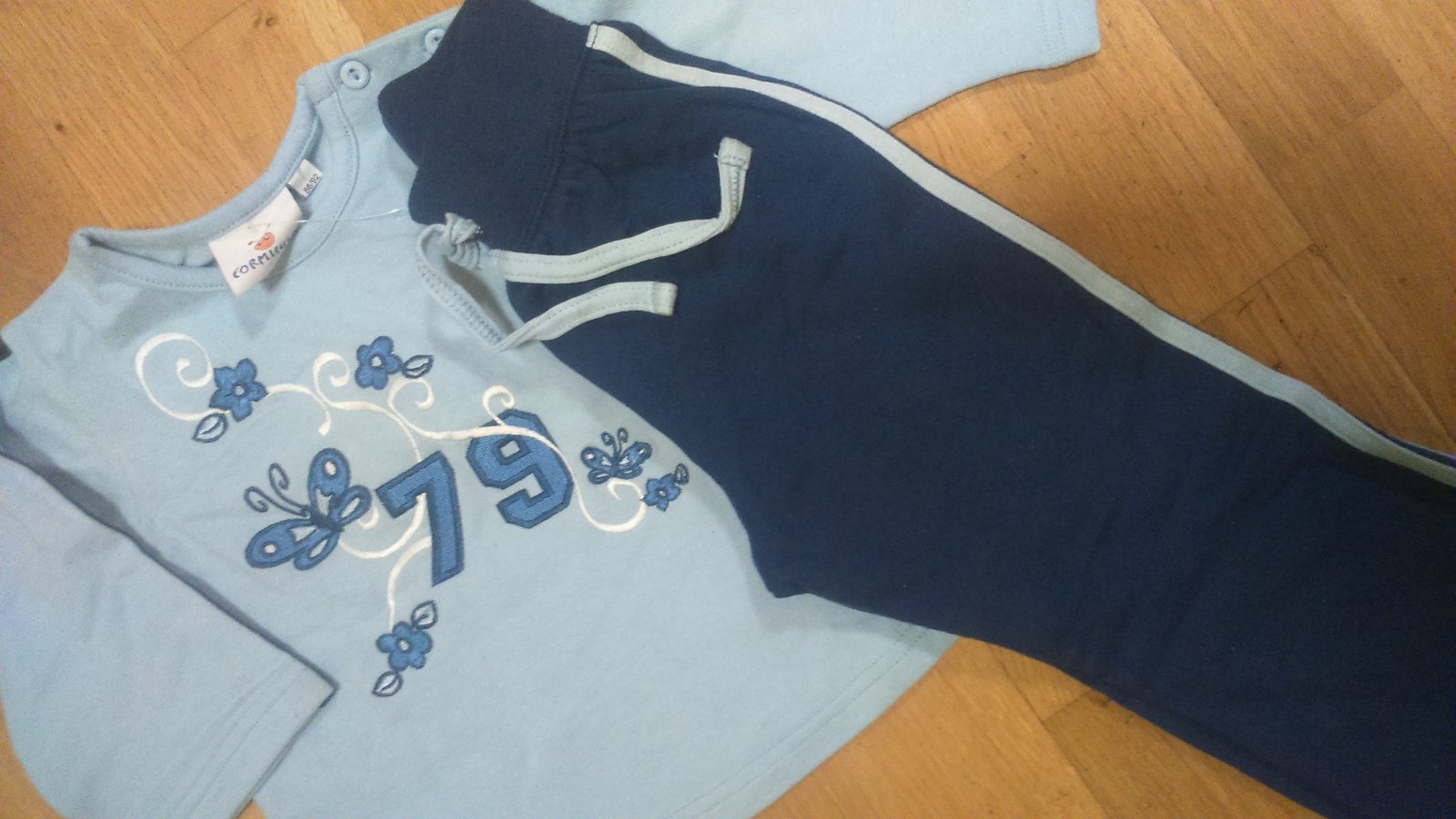 Koupeno na Tchibo .Příjemný materiál -slušivá. Nošeno od vel.80. Pružný materiál. Rozměry: tepláky délka 49 cm, vnitř.strana 33,5 cm mikina. délka 39 cm rukáv 33 cm