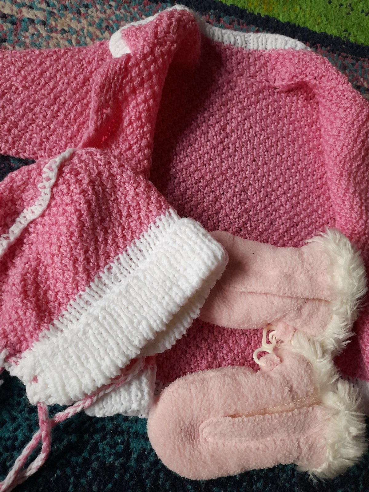 Malá růžová sada do porodnice,svetr a čepička,ruka