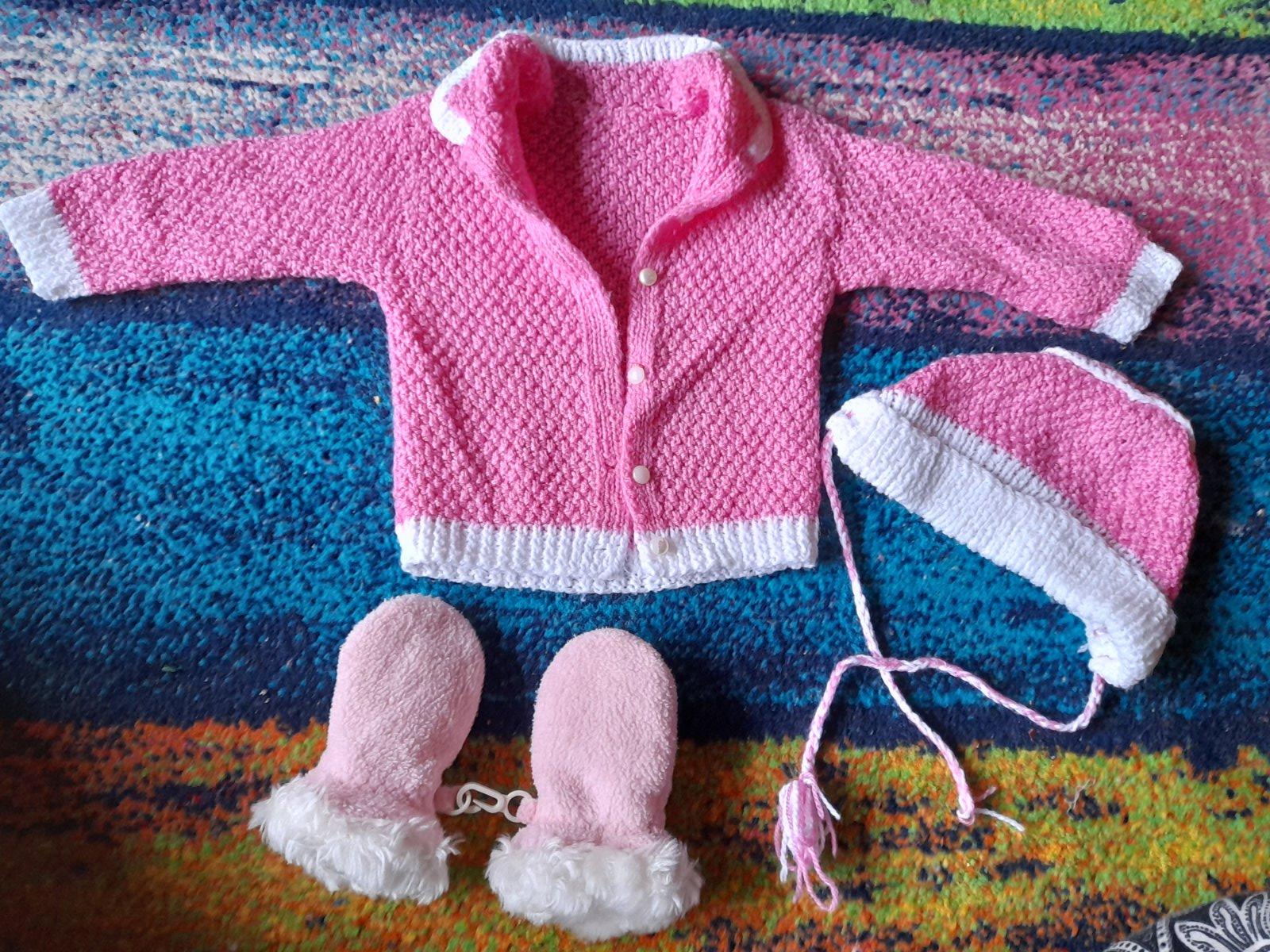 Starší pletená sada do porodnice,svetřīk a čepička,zdarma přidám rukavičky malé růžové,nošené,ale ok stav,cena za vse na fotu 30,-