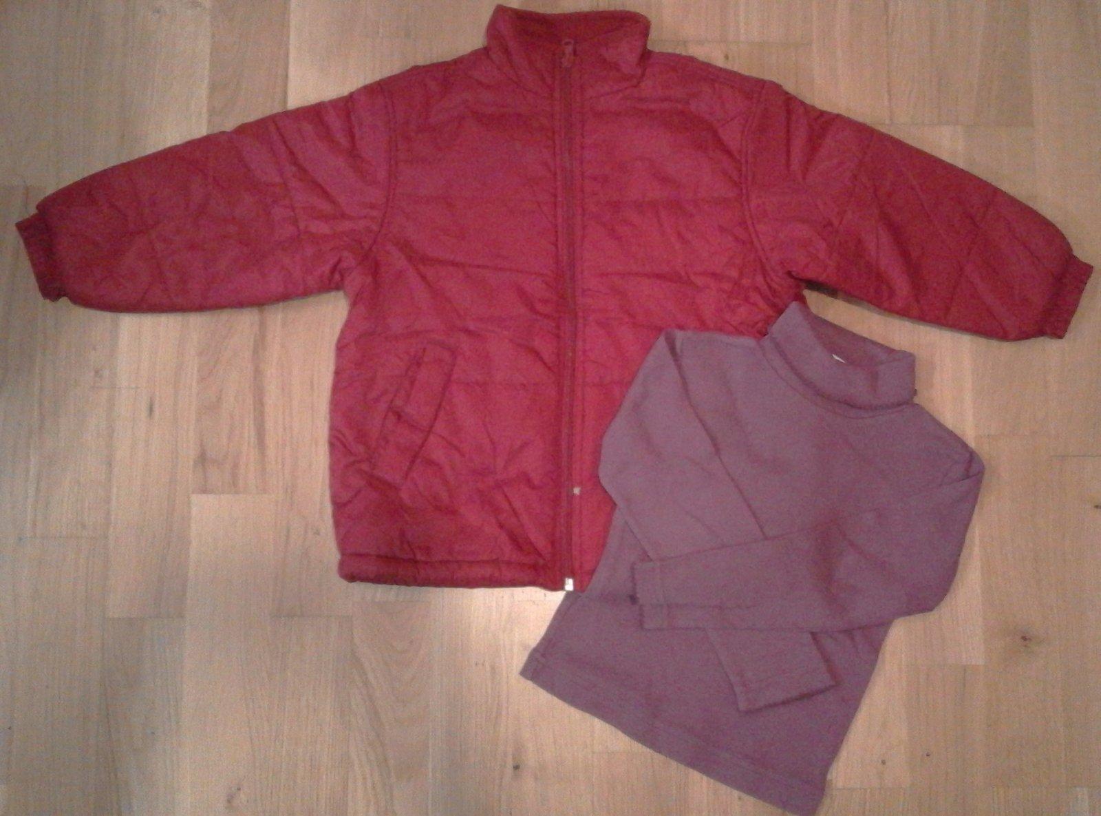 Červená zimní bunda (možno využít jako přechodovu jaro/podzim). Na druhé fotce ukázana malá trhlinka, jinak bez známek poškození. Fialkový roláček, bez poškození. Velikost 108
