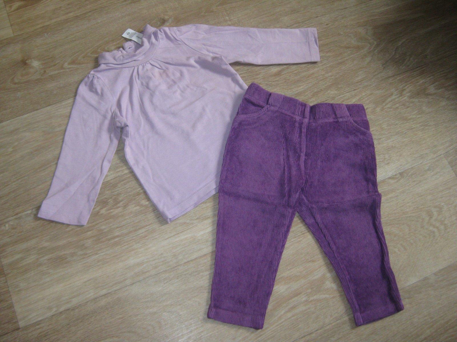 Komplet je nošený, triko má málo znatelné flíčky a na spodním lemu dírečky. Sametové kalhoty jsou pružné, v pořádku.
