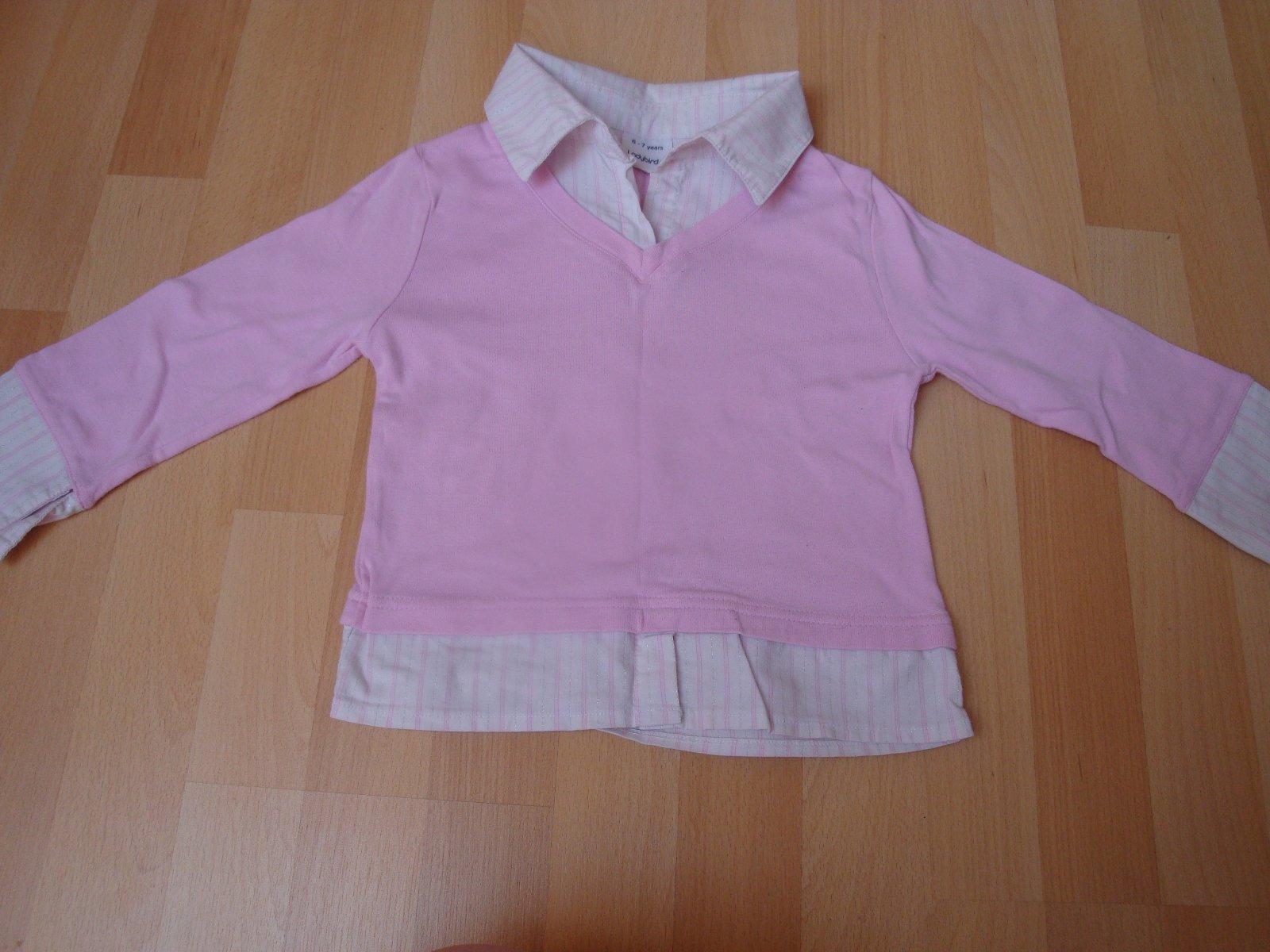 Nádherná růžová košile s trikem 2v1. Košile má dlouhý rukáv a límeček. Košile má stříbrno-růžový proužek a triko, které je všito do košile je růžové. Velikostně odpovídá č. 122, ale na košili je uveden věk 6-7, je ale spíše pro děvčata ve věku 5-6 let. Zn. Ladybird. Top stav, dcera jí měla na sobě pouze 2x. Výše poštovného činí 32,-Kč obyčejně nebo 49,-Kč doporučeně. Pro více informací mě prosím kontaktujte.