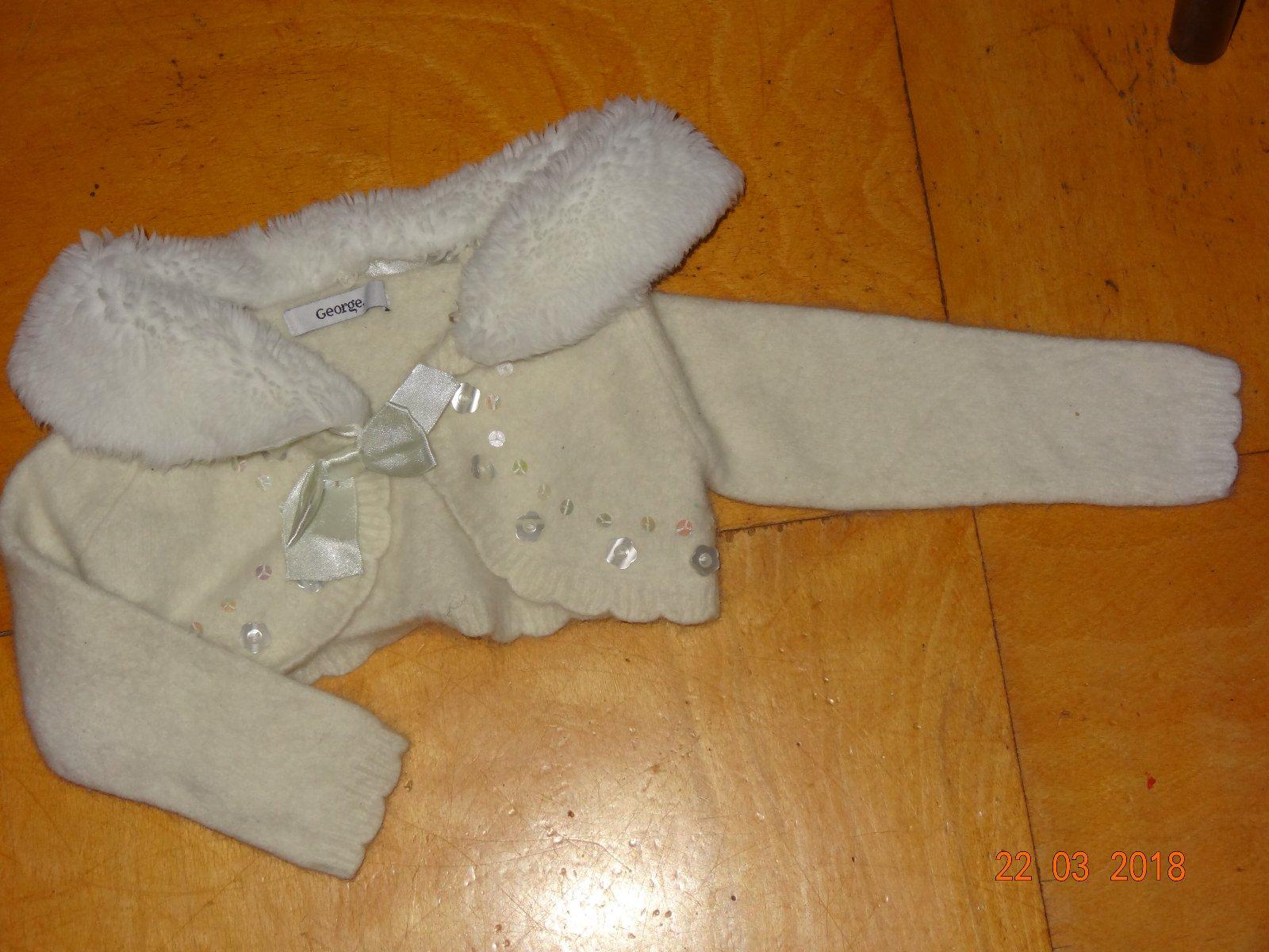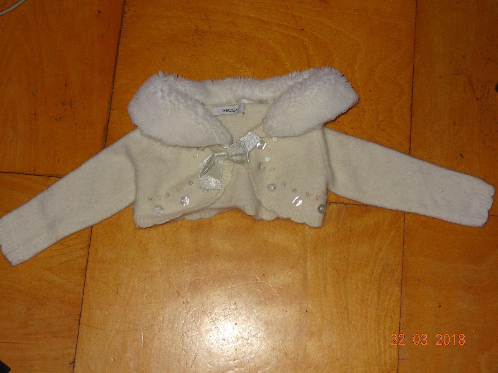 Prodám dívčí kabátek - bolerko, značky George, límeček je oddělávací na knoflíčky, velikost 98 - 104, složení 60 % ovčí vlna, 20 % angora, 20 % nylon, složení límec 80 % akryl, 20 % polyester, v perfektním stavu. Cena 80 Kč + poštovné. Krabice č. 4.