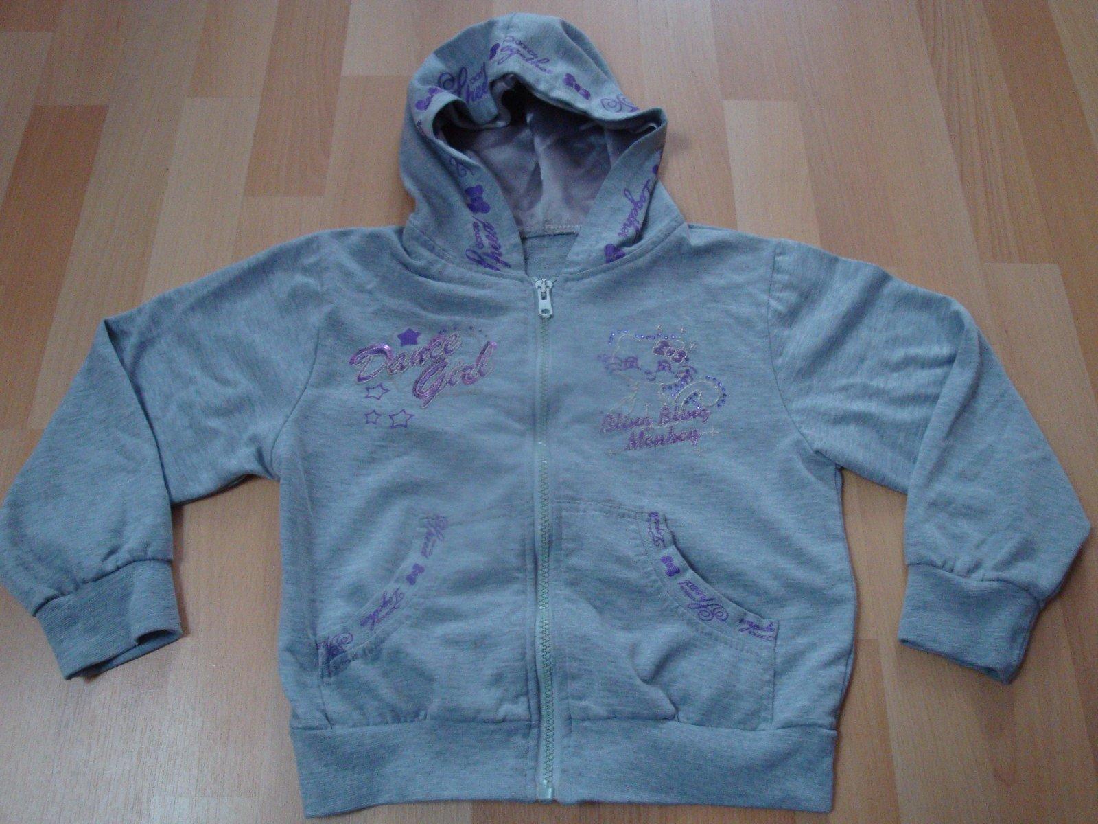 Krásná, světle šedá mikina s motivem kočičky. Mikina je na zip, s kapucí. Vpředu je spousta flitrů a fialových výšivek. Vhodná pro holčičky ve věku 4-6 let. Velmi dobrý stav.