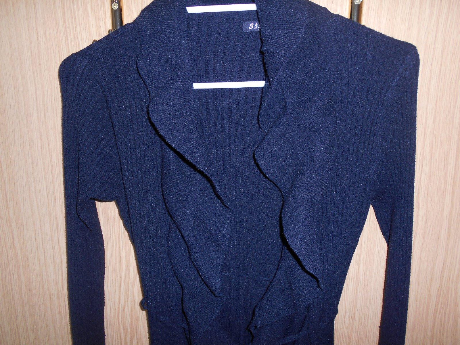 Prodám krásný černý úpletový kardigan s volány,pasuje na velikost S/M,délka 90cm,šířka 2x45-55cm,je velmi pružný,v pase šňůrka,délka rukávu od krku 74cm,průramek 2x25cm,nošený jen na slavnostní příležitosti,párkrát vzaný,vypadá moc hezky oblečený,omluvte foto,ale foťák mi to nechtěl lépe nafotit,skutečně je čistě černý,cena 300kč.