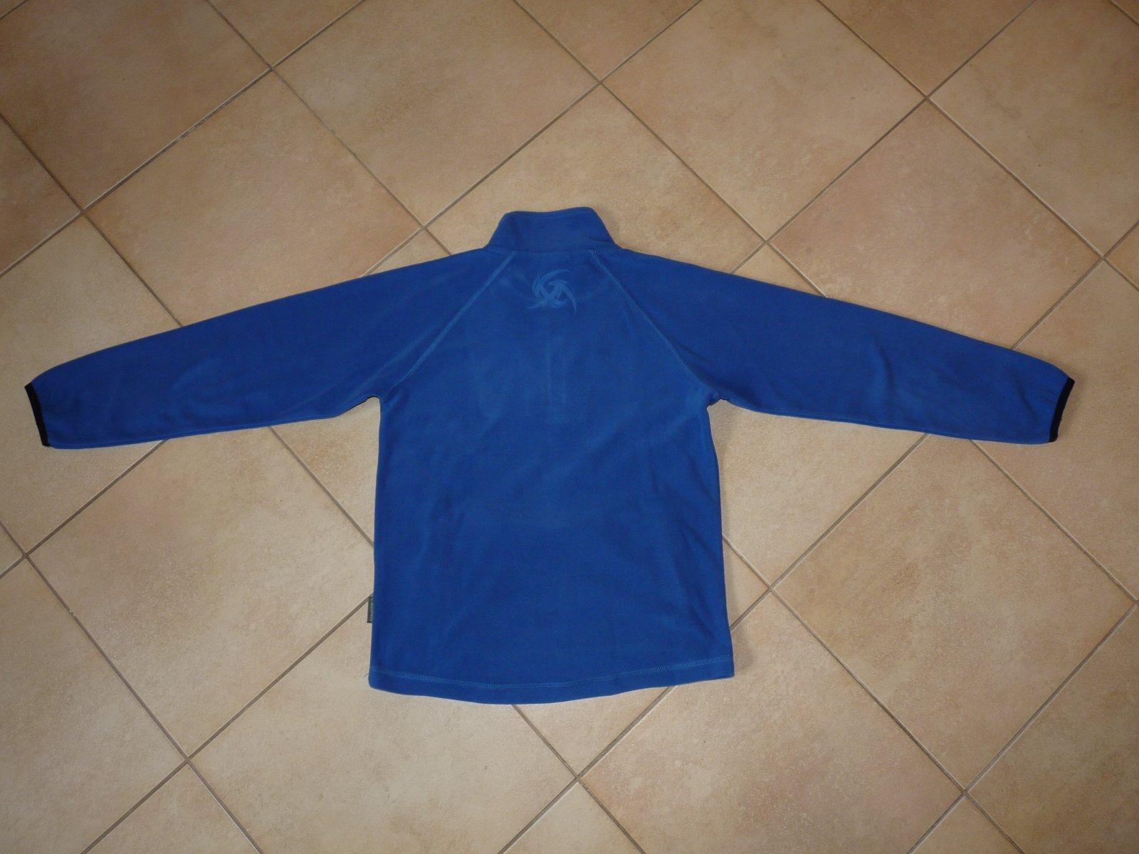 Moc hezké triko/mikina micro fleece, barva jasná modrá ani světlá ani moc tmavá. Kupované nové, vel. 128/134, zn. Lewro, velice příjemné na dotek. Vepředu 2 kapsy na zip, rukáv ukončený pružnou lemovkou. Zadní díl mírně do oblouku.