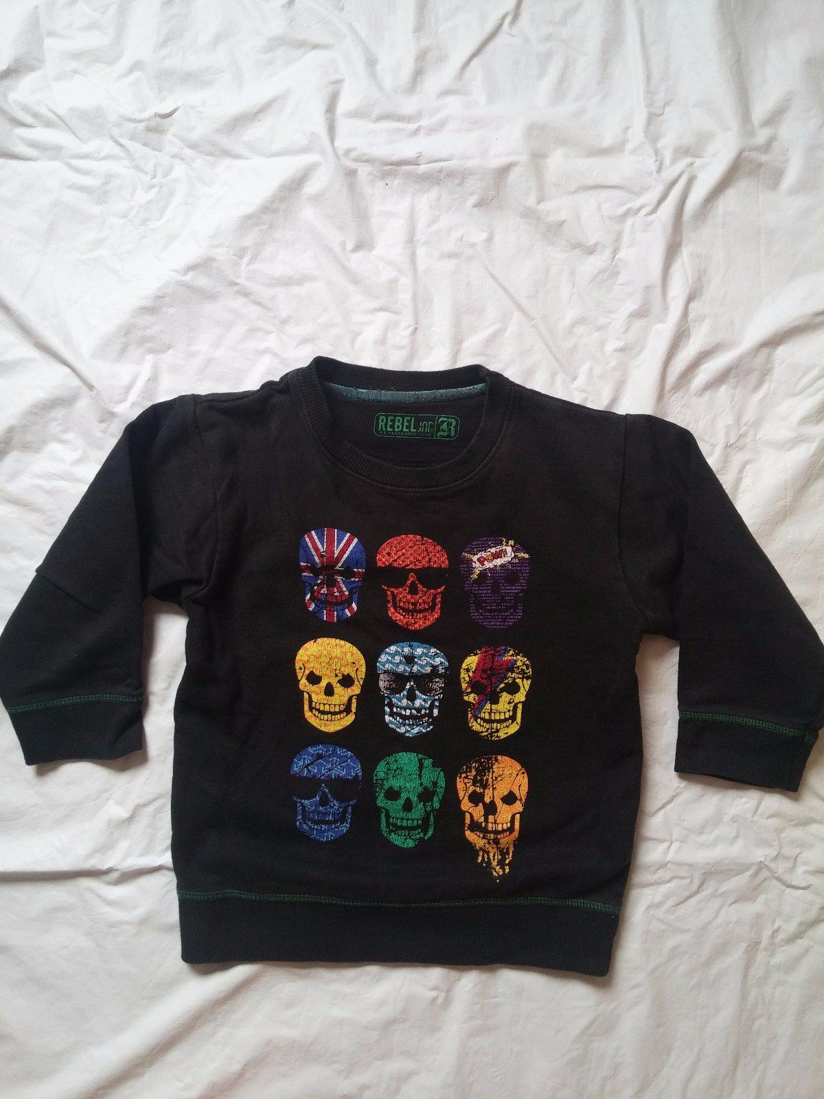 Mikina vel. 110 s lebkama, nošená, bez vad, možná barva již není 100 % - sytě černá, ale pěkná délka 44,5 cm, rukáv od krku 45 cm, šířka 2x36,5, vel. 110 zn. REBEL,