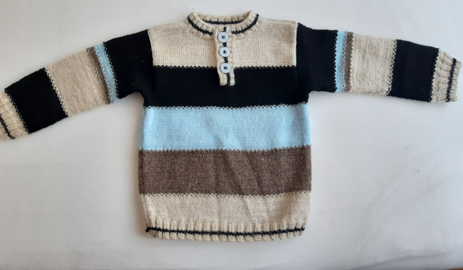 Nabízím svetr vlastní výroby z akrylu, po 1 synkovi. Rozepínací knoflíková léga - při oblékání nutno rozepnout.
