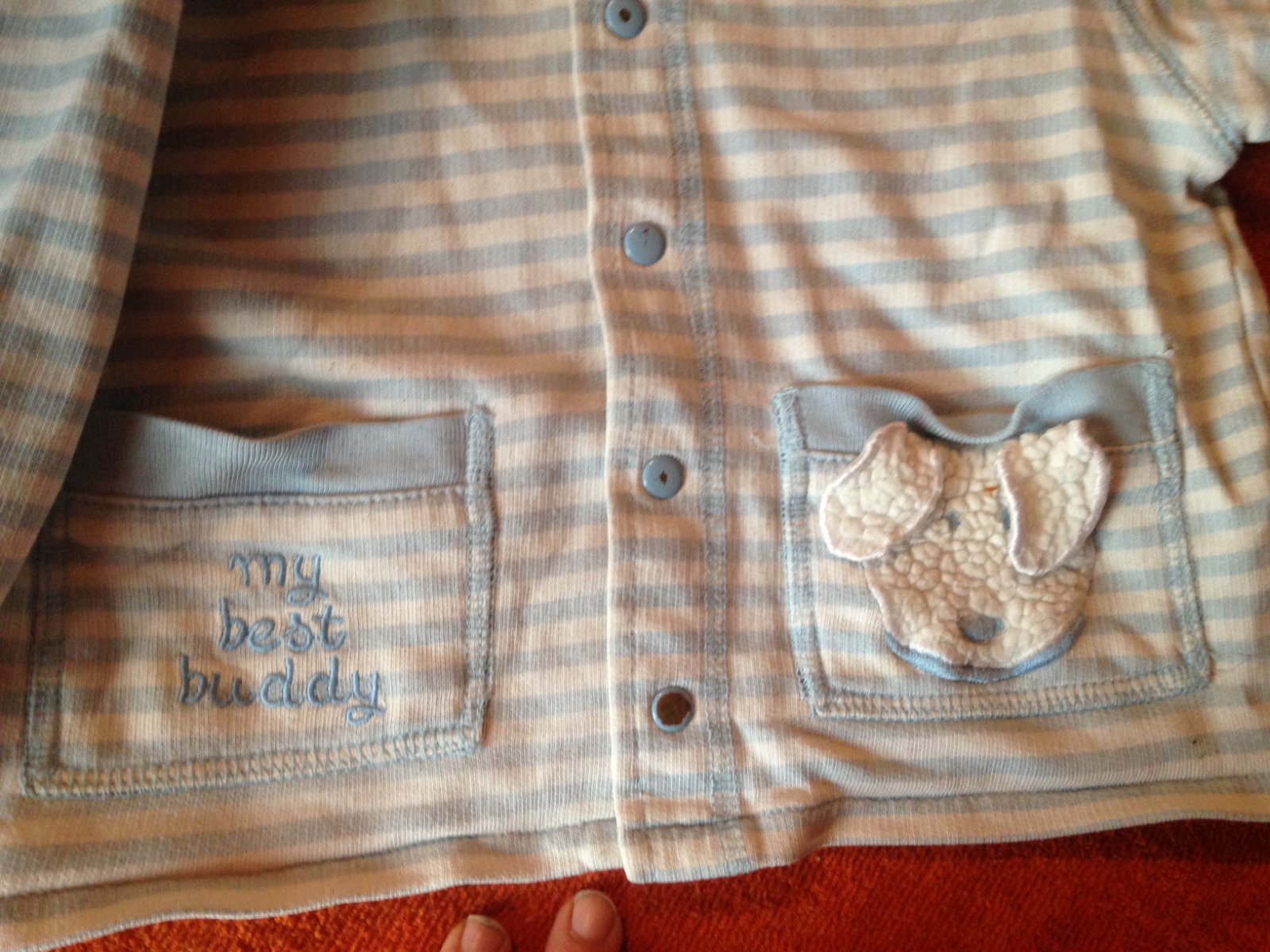 Prodám halenku - mikinku v pěkném stavu, velikost: 80, u kapsičky s pejskem je malá dírka, šikovná maminka spraví, cena tomu přizpůsobena. Cena halenky - mikiny je: 20 Kč + poštovné. Krabice č. 38.