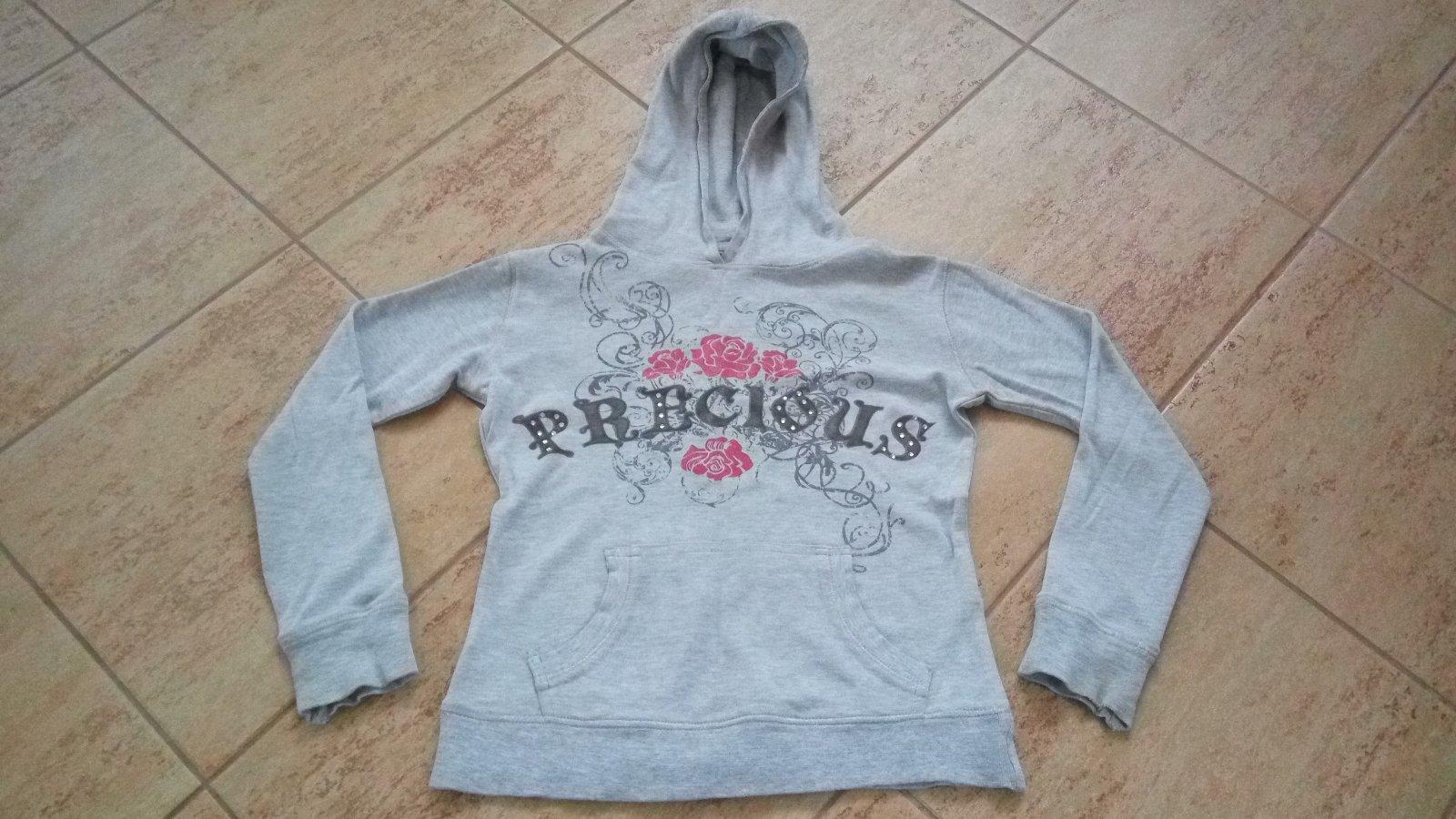 Velmi pěkná světle šedá mikina pro děvčata ve věku 6-8 let (vel. 128/134). Mikina má kapuci, vpředu velký motiv a klokaní kapsu. Na rukávu (u zápěstí) je zašitá dírka, jinak velmi dobrý stav. Výše poštovného činí 55,-Kč za doporučený balíček. V případě dotazů mě prosím kontaktujte.