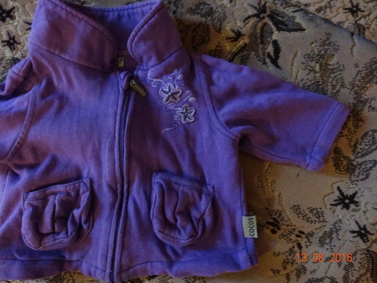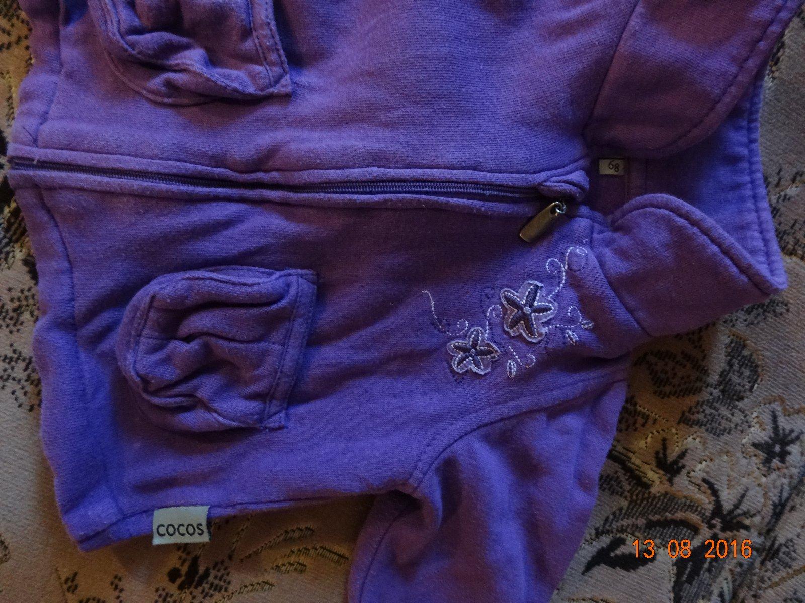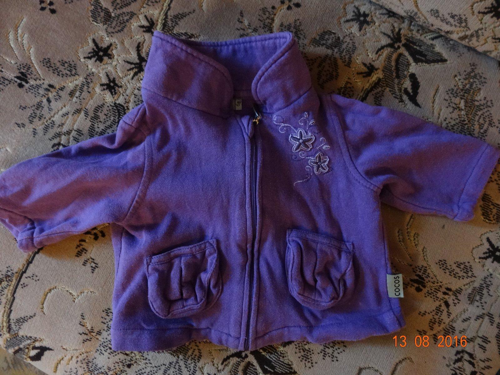 Krásná fialová mikinka značky Cocos, velikosti 68 s kapsičkami na zip, materiál 100 % bavlna, cena 49 kč + poštovné.