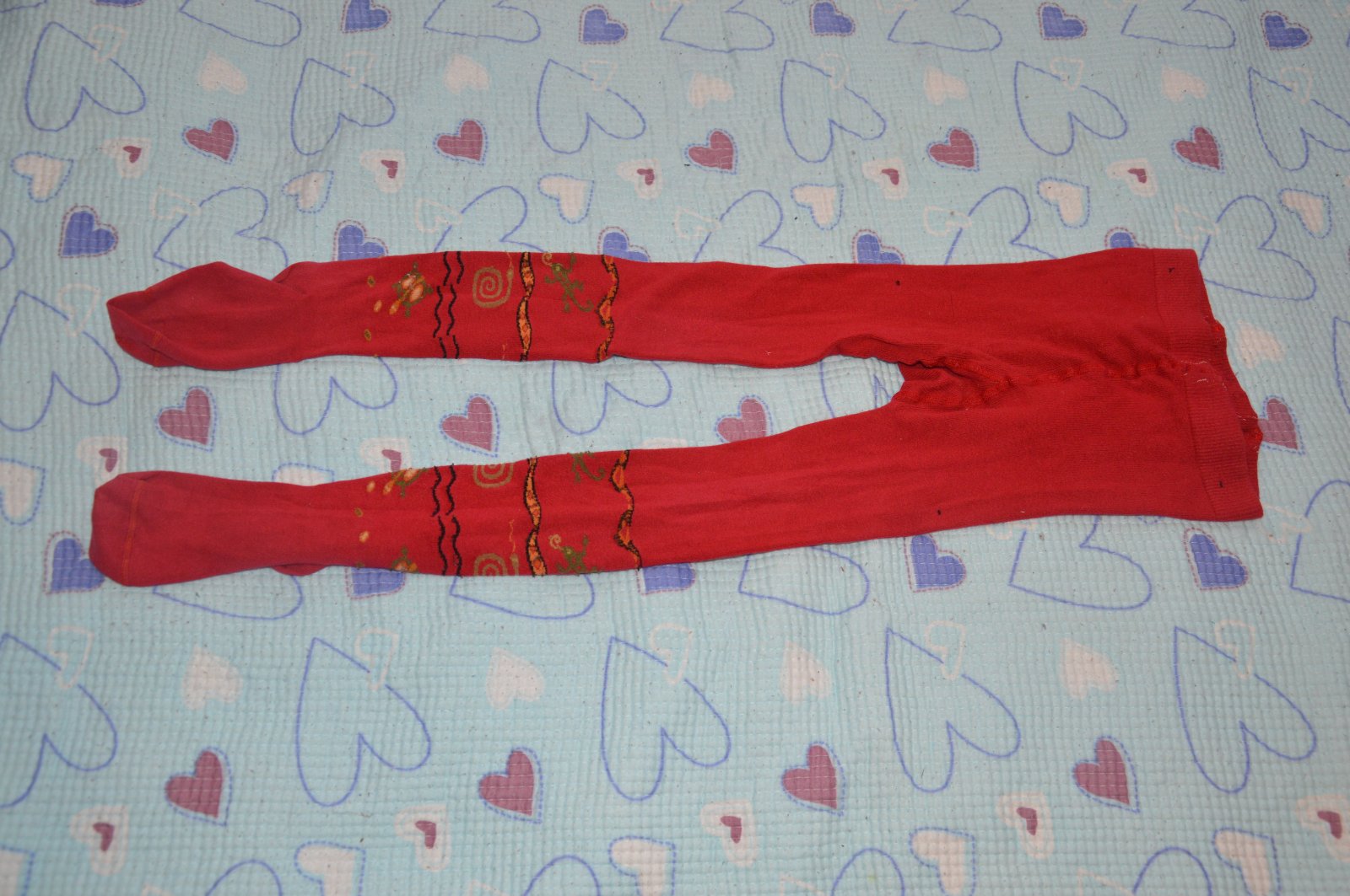 červené s obrázky plazů (ještěrka, had, želva), stř, teplé, supr materiál, příjemné, kvalitní, palečky trochu zeslabené, jinak fajn. vel cca 104/110/116 (hodně elastické, vytáhnou se!!)