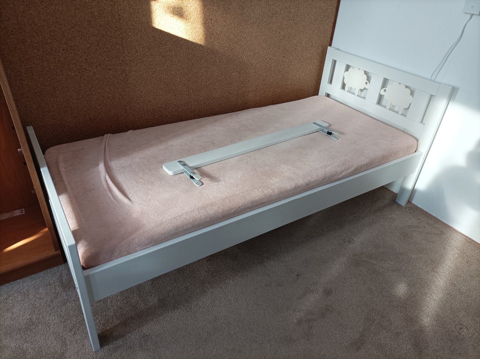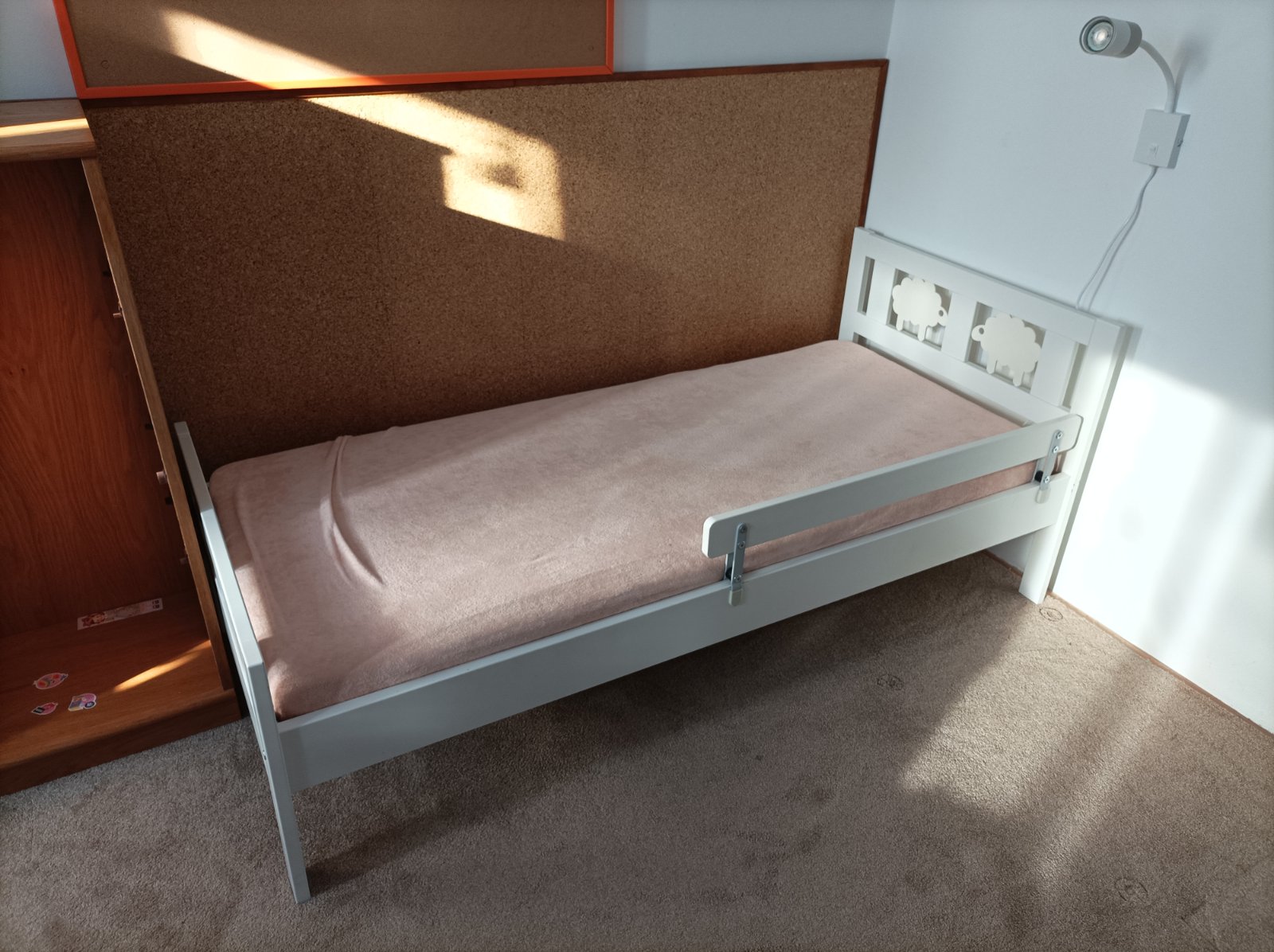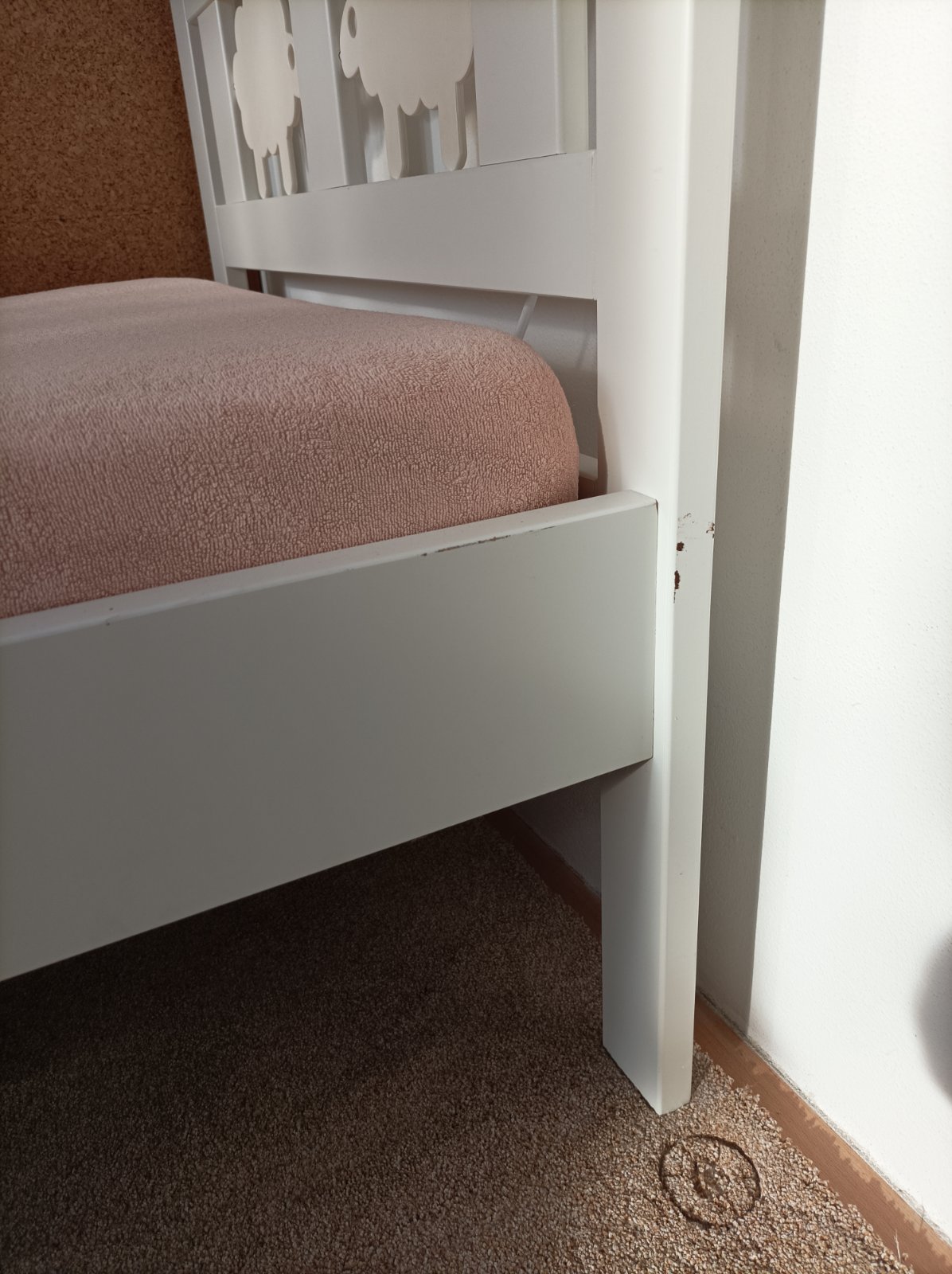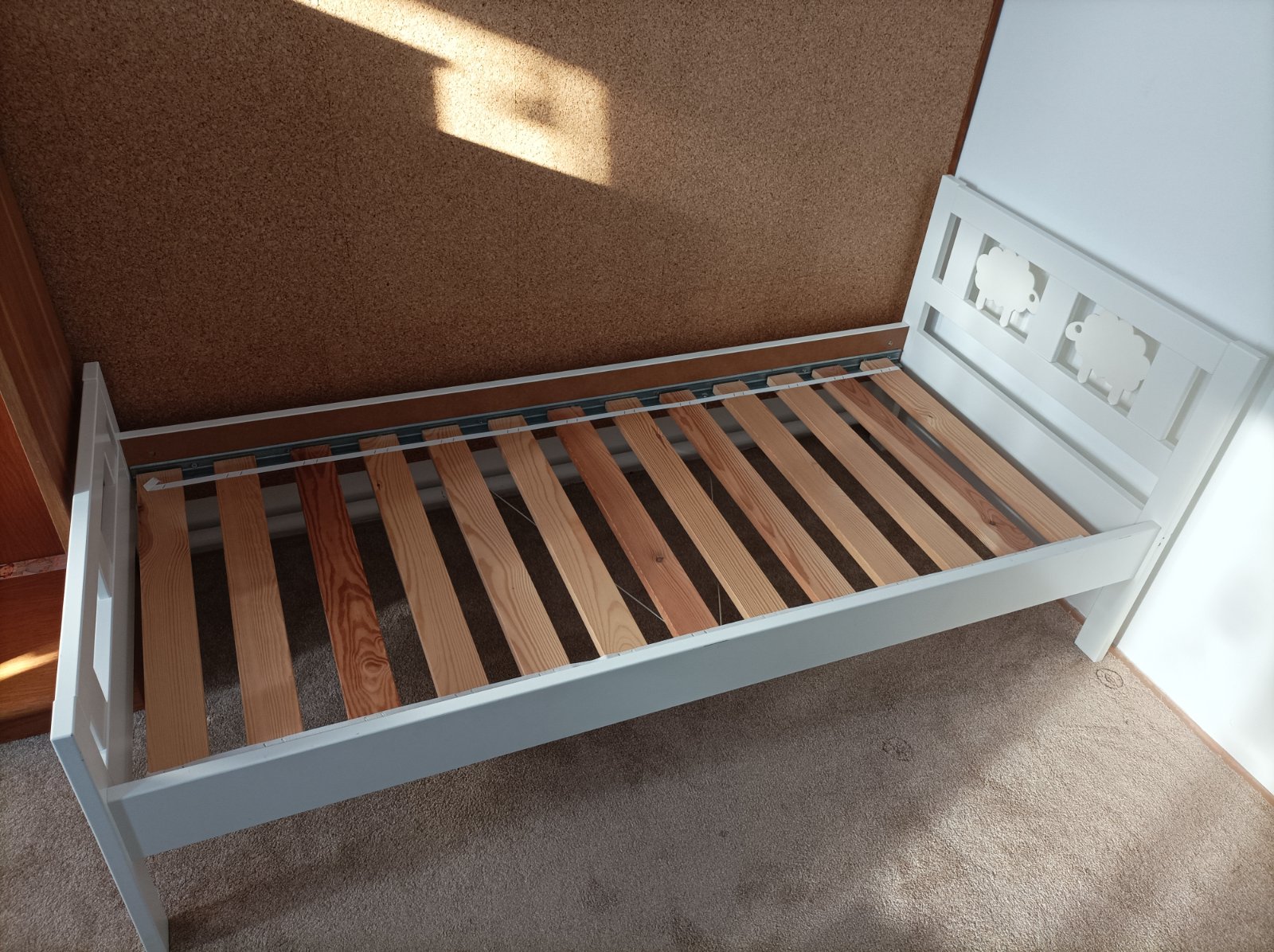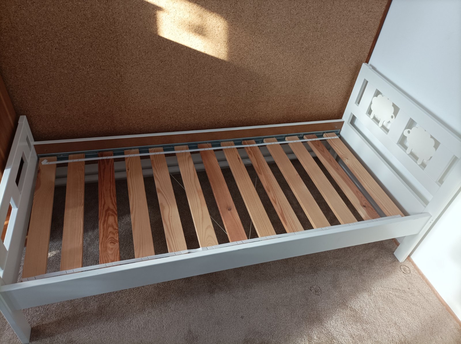 Dětská postel Ikea Kritter včetně jedné zábrany, roštu a matrace 70x160 cm. Postel je používaná, na pár místech trochu odřená barva. Postel je rozebraná.