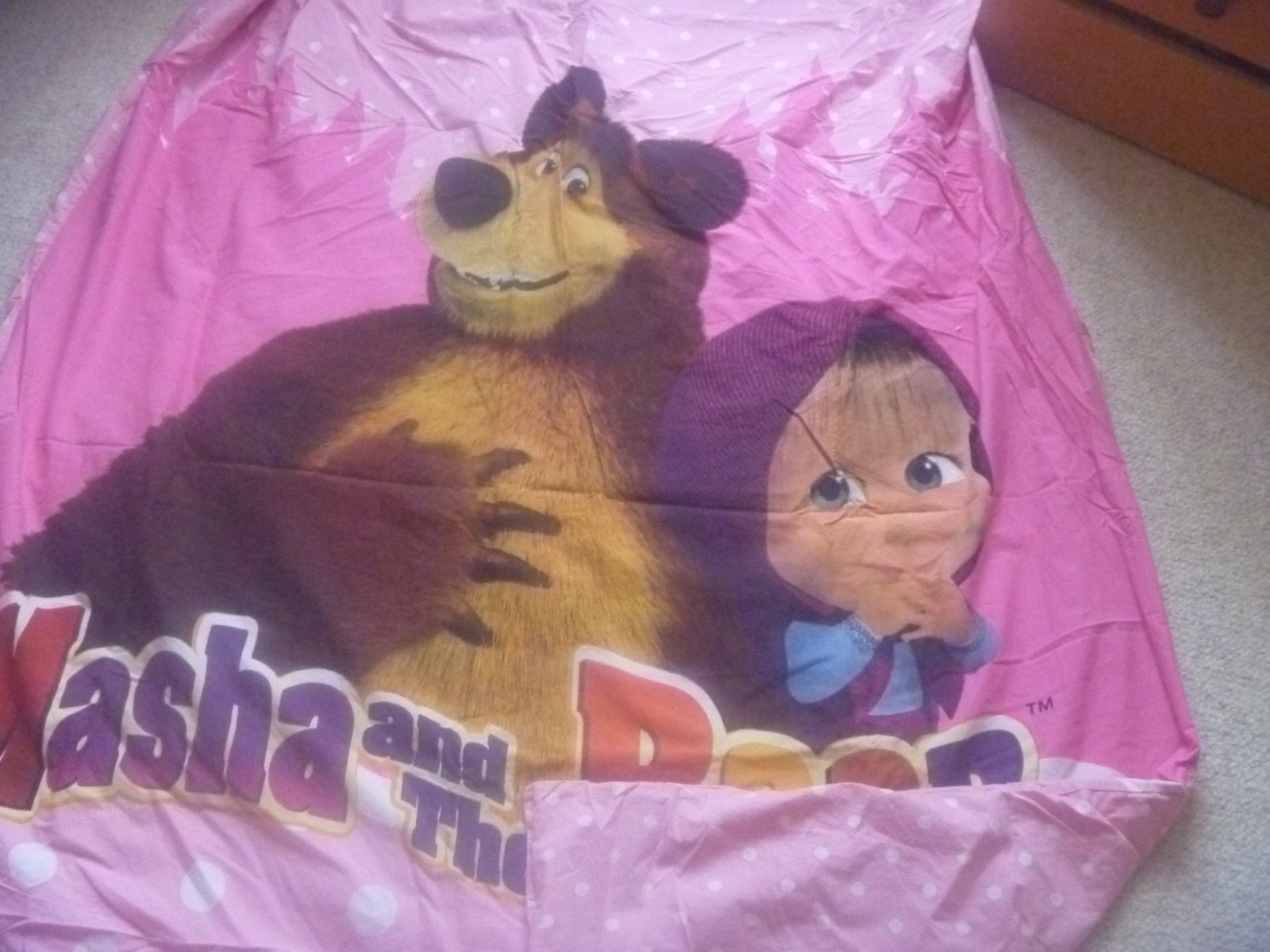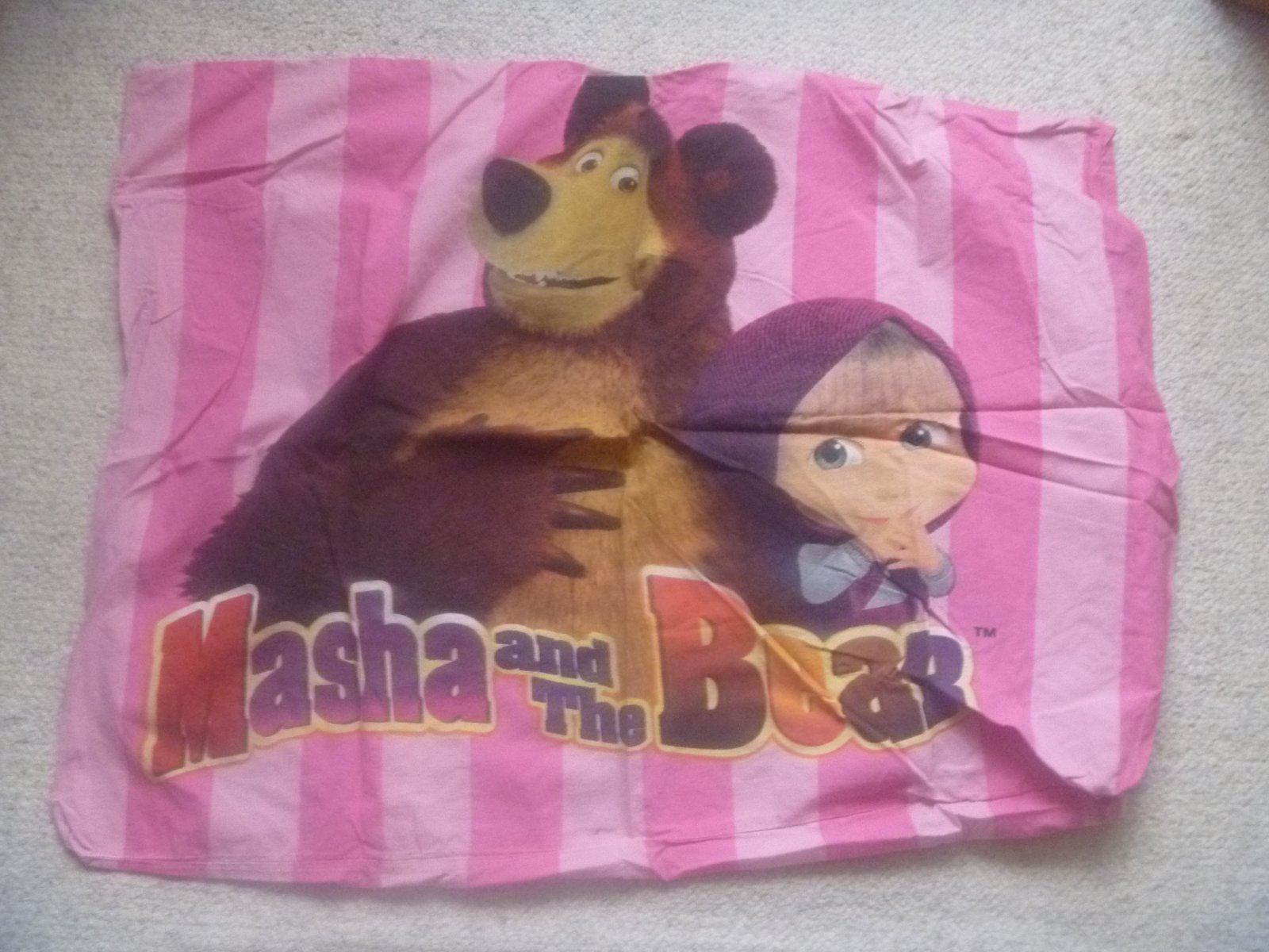 Prodám oboustranné povlečení na velkou postel Máša a medvěd, materiál 100% bavlna, zapínání peřina na druky, jedna strana s obrázkem, druhá s puntíky, polštář s kapsou, dobrý stav.