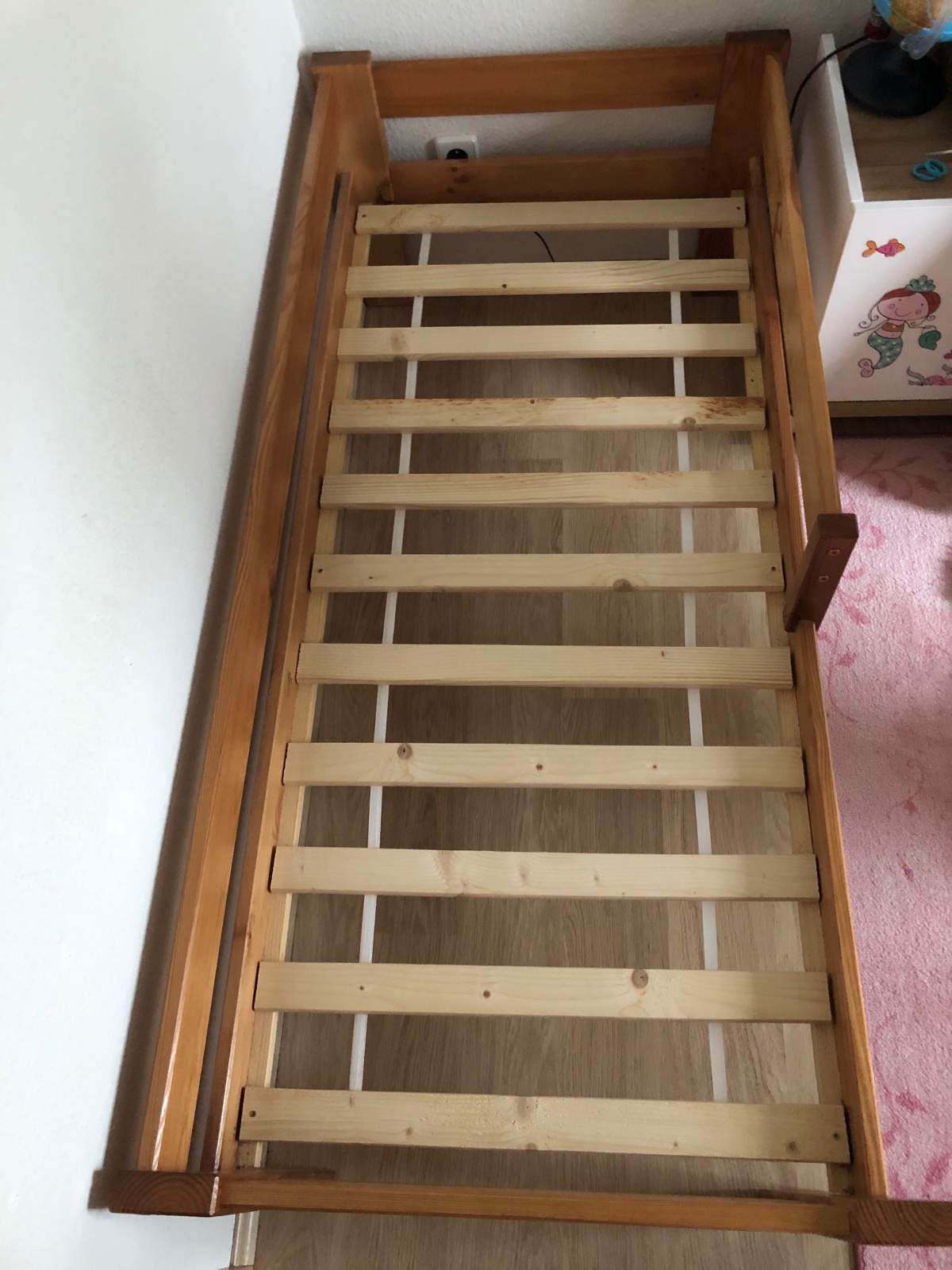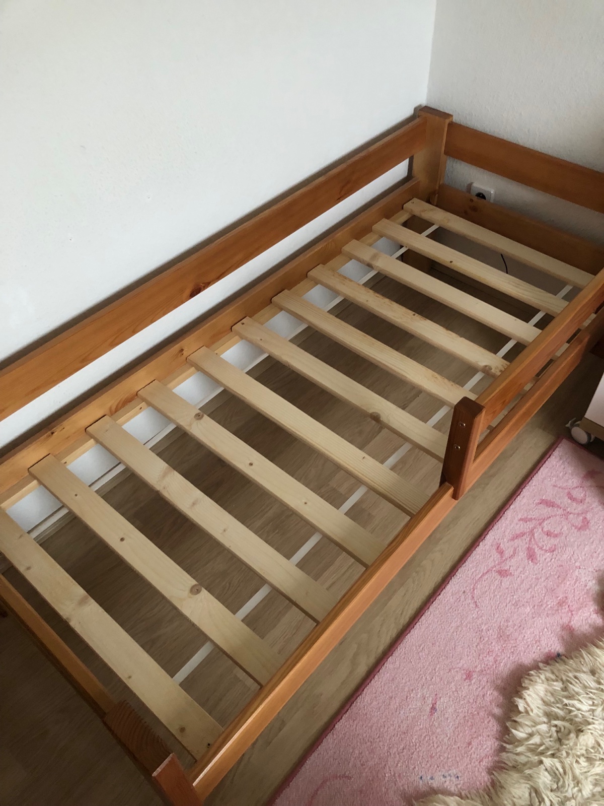 Postel ve velmi pěkném stavu. Používaná 3 roky. V ceně matrace Ikea UNDERLIG s pratelným potahem používána pouze poslední rok, protože původně koupená matrace nebyla kvalitní.