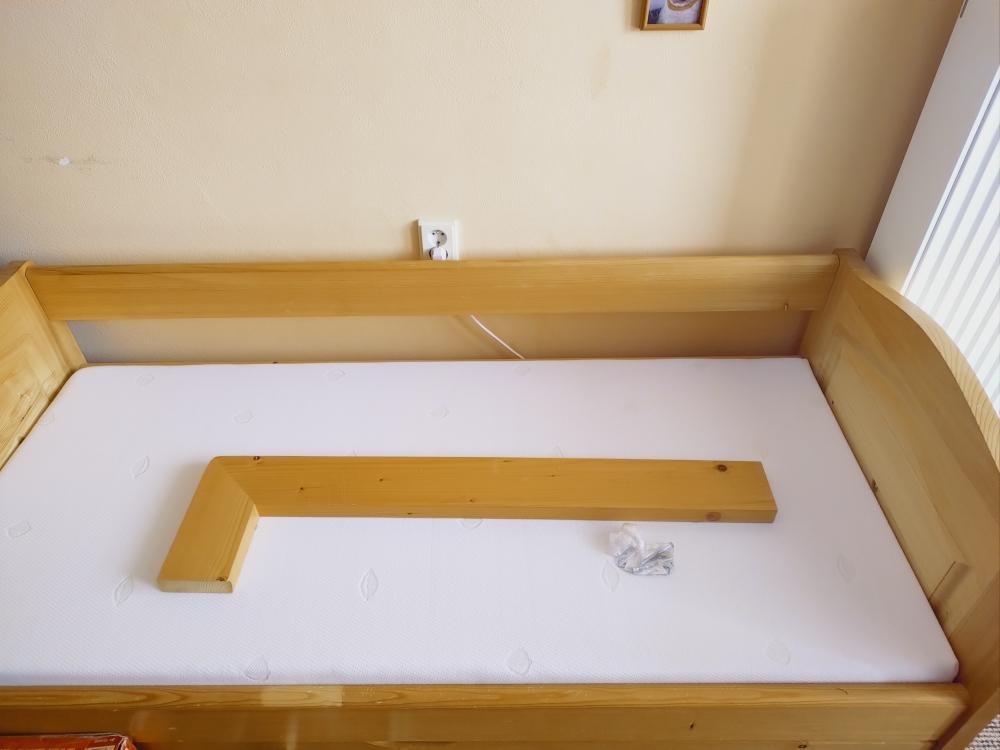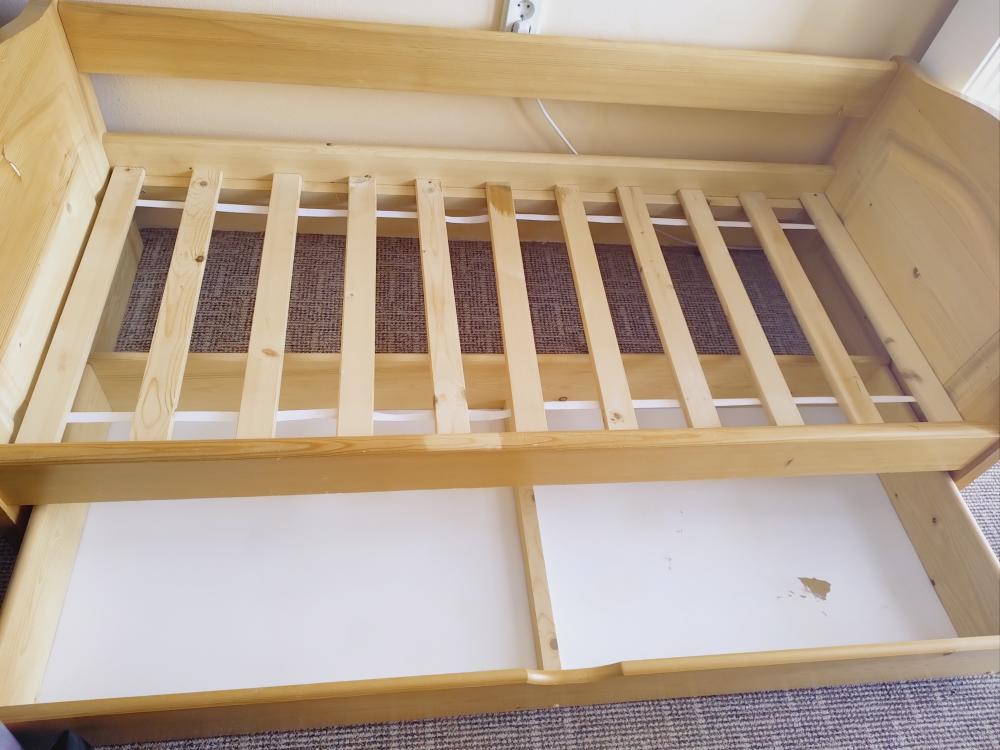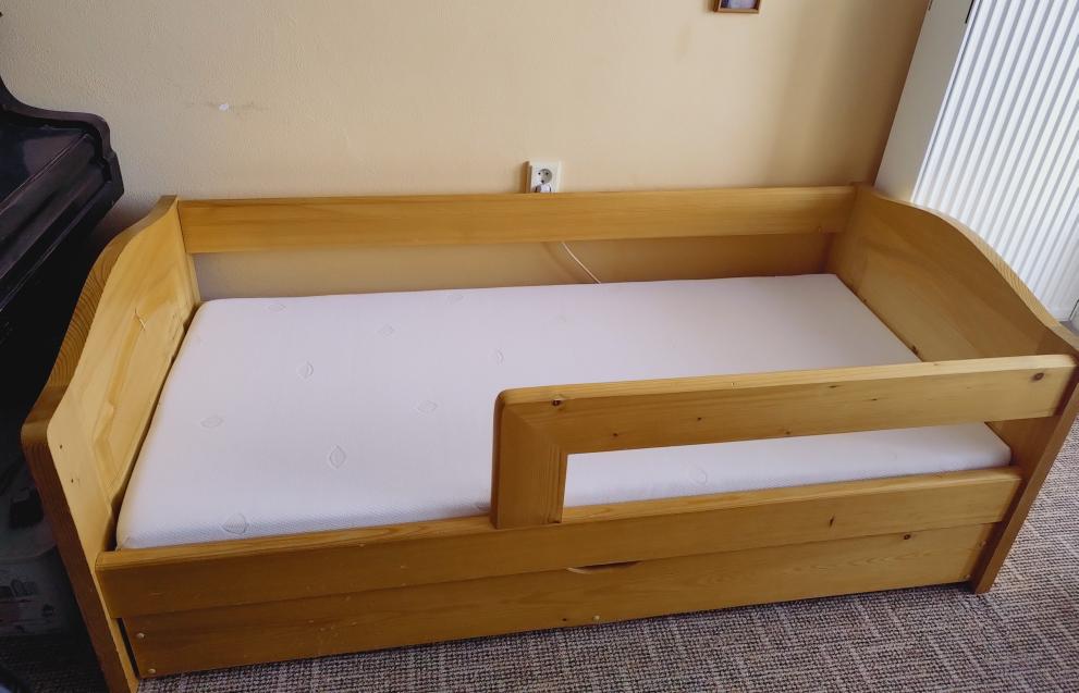 Prodám kvalitní dětskou postel z borovicového dřeva o rozměru 160x70 cm s úložným prostorem ( celkové rozměry postele 168x78 cm, výška ložné plochy 35 cm, výška čela 64 cm). Součástí je pěnová matrace se snímatelným potahem a pevný laťkový rošt. Bočnice se dá použít z obou stran. Postel je po jednom dítěti, zachovalá, jeví mírné známky opotřebení - v šuplíku v pravé části odřená barva, na funkci nemá vliv. Pouze osobní odběr - Želešice u Brna.