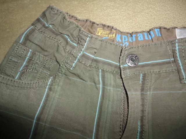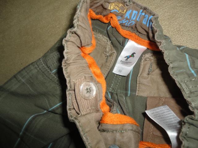 Pohodlné, bavlněné kraťasy, s tyrkysovou a hnědou proužkou, pas na regulační gumu, prošitá kolena, vpředu nad kapsou vyšitý koník typický pro oblečení PALOMINO, vzadu hezky zpracované kapsy, d. 36, od rozkroku dolů 19, pas max. 26cm