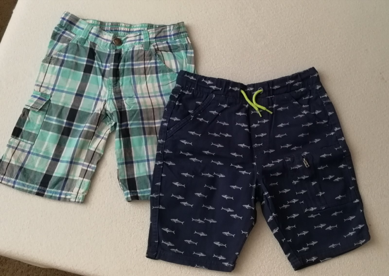 Dětské kraťasy vel.122 -ty světlejší mají zapínání na zip a knoflík+(postranní gumičky v pase).... za 100 Kč. Druhé tmavé vel.134 v pase mají šňůrku na stáhnutí...za 110 Kč.
