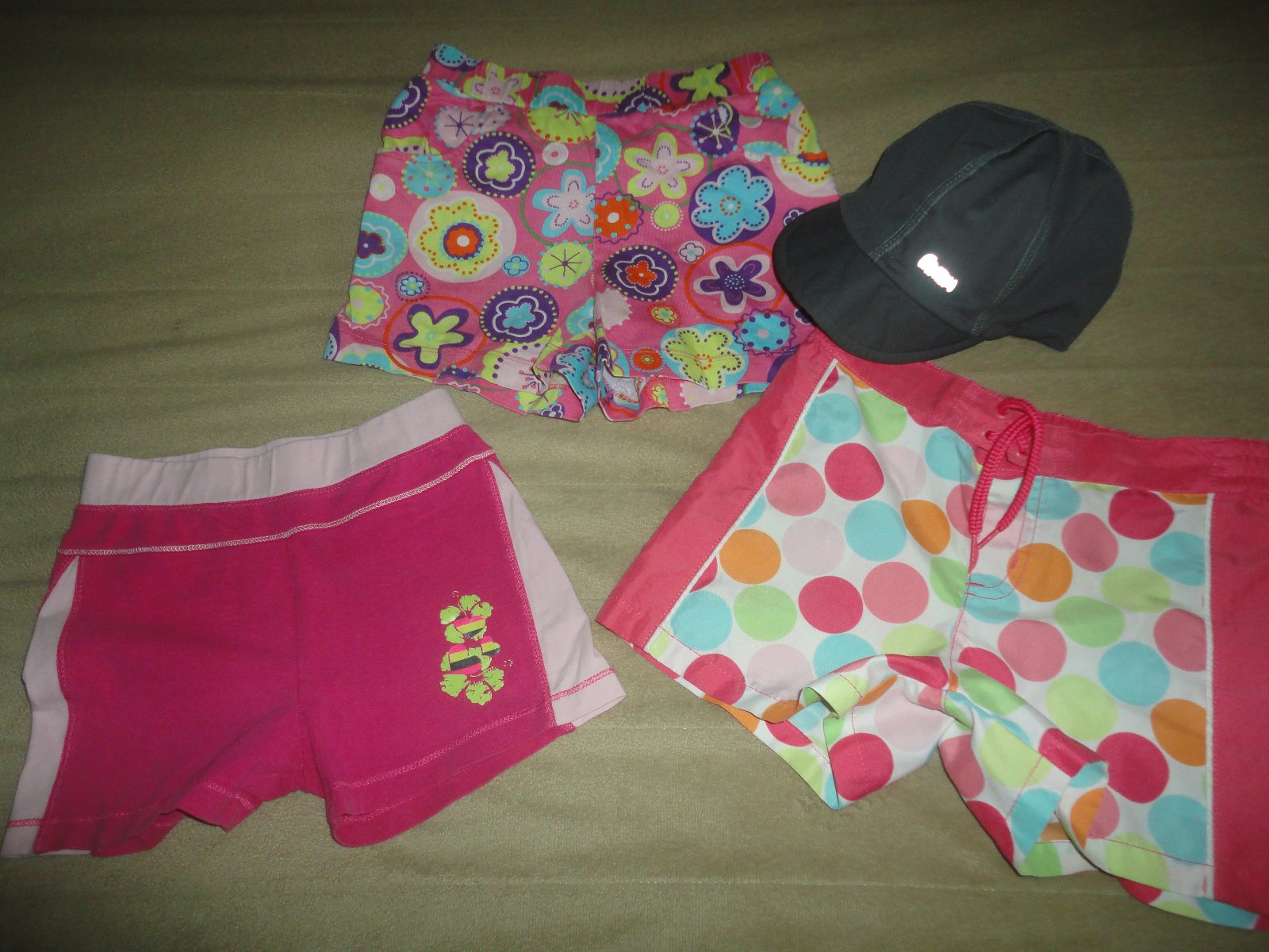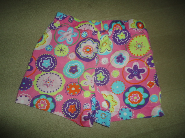 Pozdní nákup, pouze 1x prané, bavlněné kraťásky s veselým potiskem květů na růžovém podkladě, boční kapsy, pas guma, d. 25,5cm, vnitřní 6,5cm, pas 26-31cm
