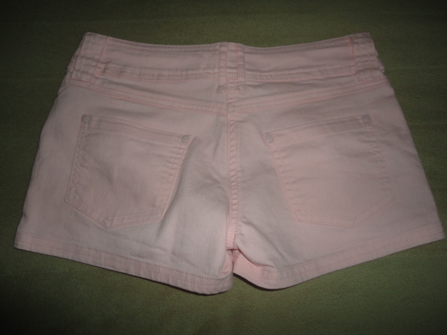 Krátce nošené nižší šortky bez regulace pasu, materiál 68% bavlna, 30% polyester, 2% elastan, barva jemně růžová, přední a zadní kapsy, kovové druky s logem, d. 25,5cm, malinké rozparečky na konci nohavice, vnitřní d. 6,5cm, přední sed 21cm, zadní 29, š. nohavice dole 24,5cm, pas 37 max., lze dát pásek