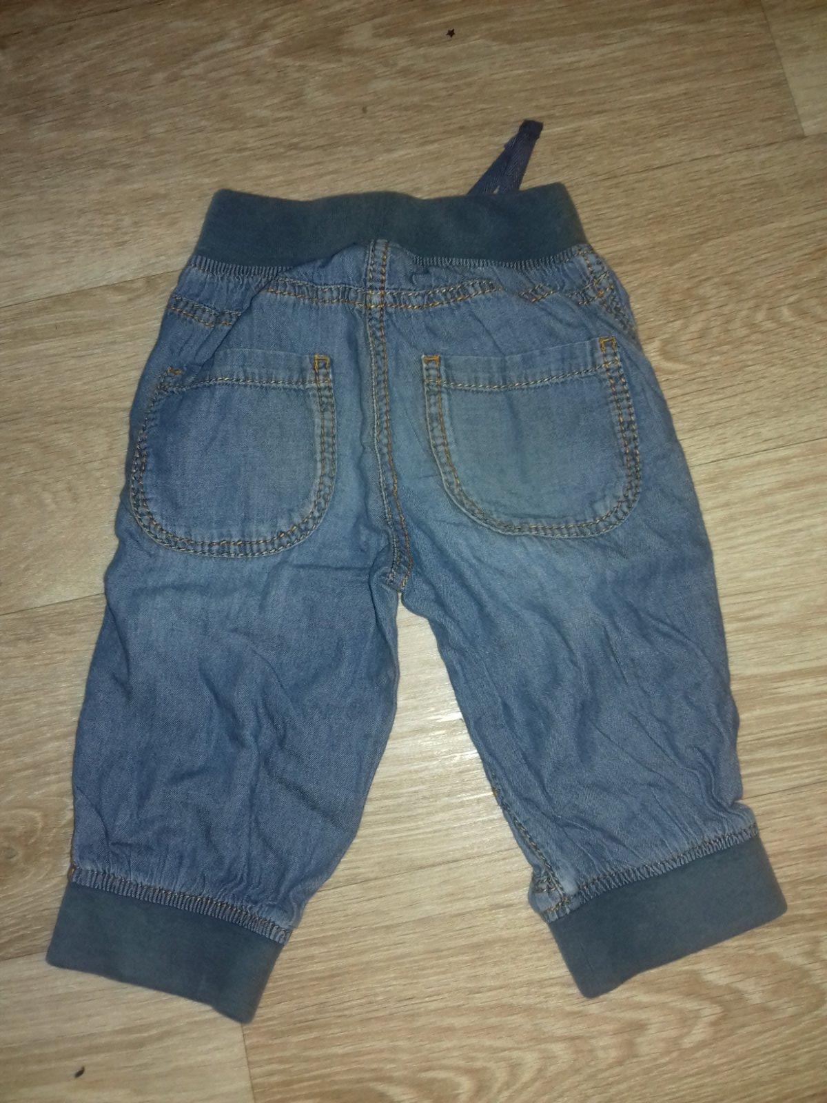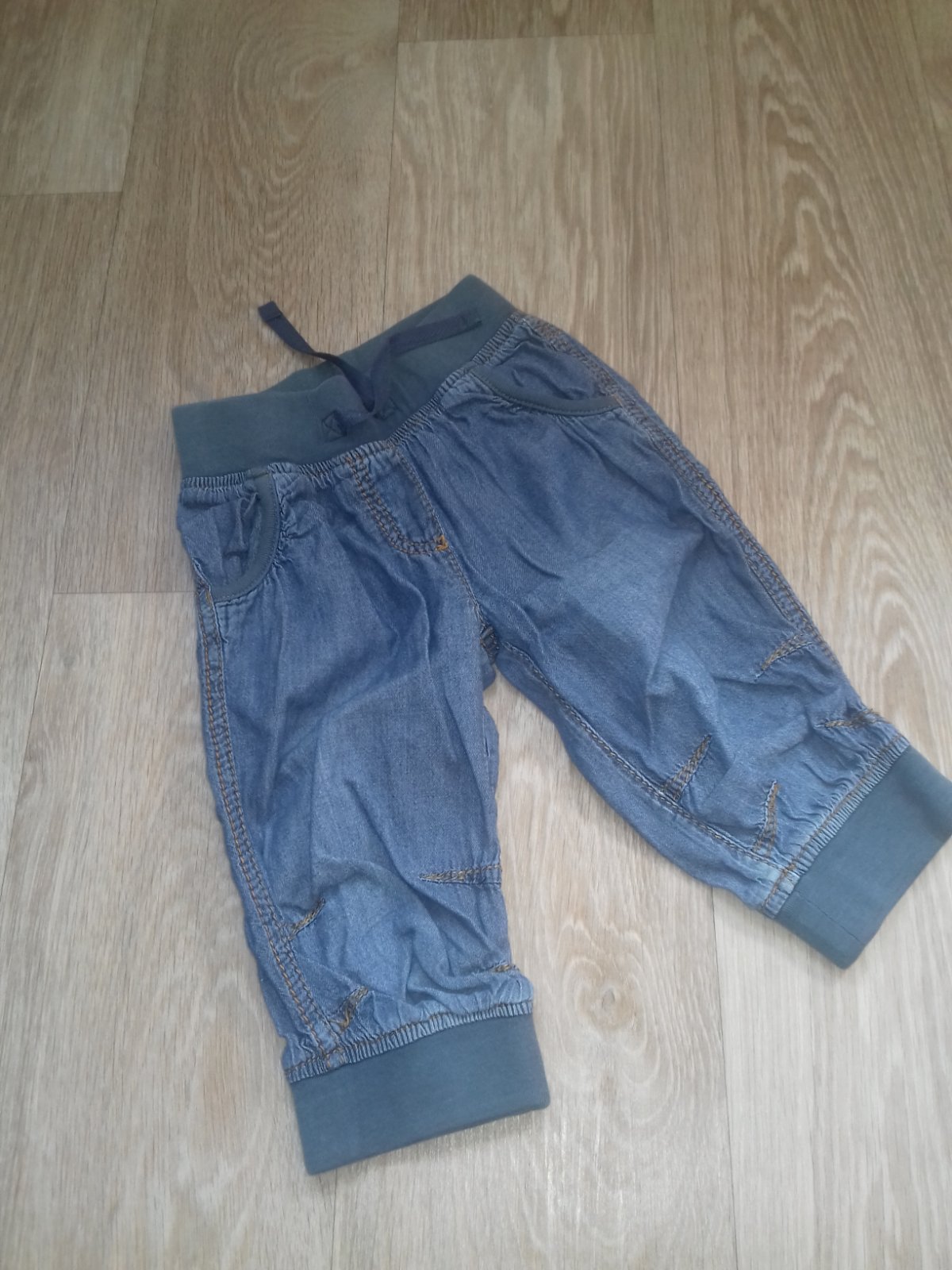 Materiál je plátno s riflovým potiskem. V pase na gumu. Tkanička na paradu. Barva odpovida 1.fotce.