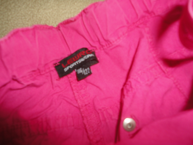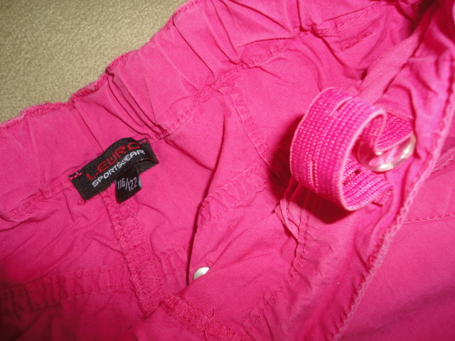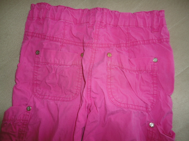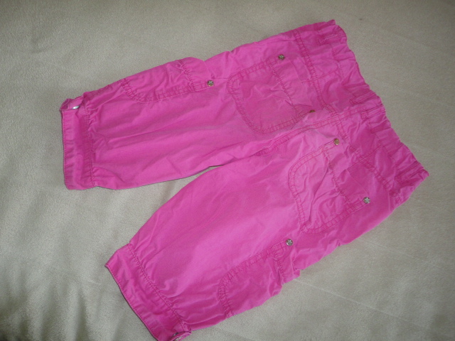 Krásně růžové,krátce nošené, bavlněné gatě s regulací pasu, vpředu vyšité logo, kovové zdobné druky kolem kapes, konec nohavice do lemu jako pumpky, rozpareček, funkční druk, uvedená velikost 6-7 let, ale přijde mi spíš na těch 6 let, měřte, d. 42, vnitřní 23,5cm, pas 28-30cm, lze stáhnout