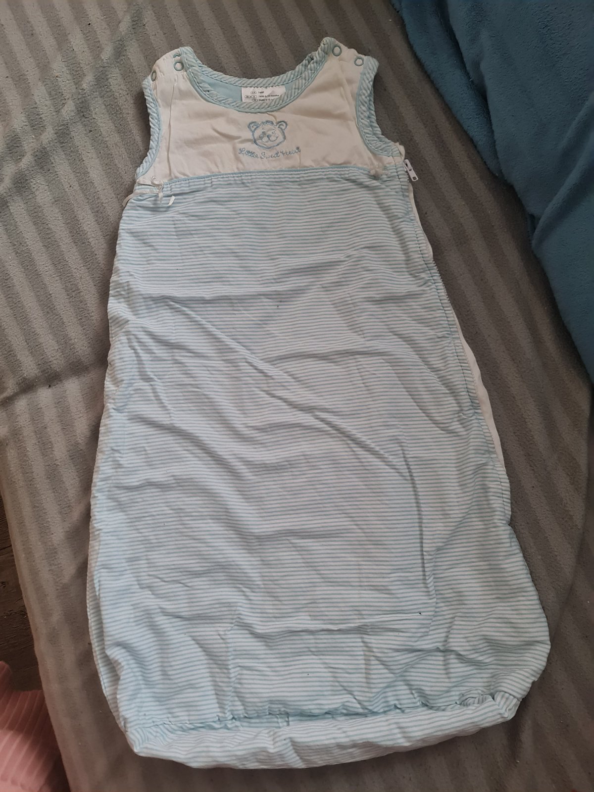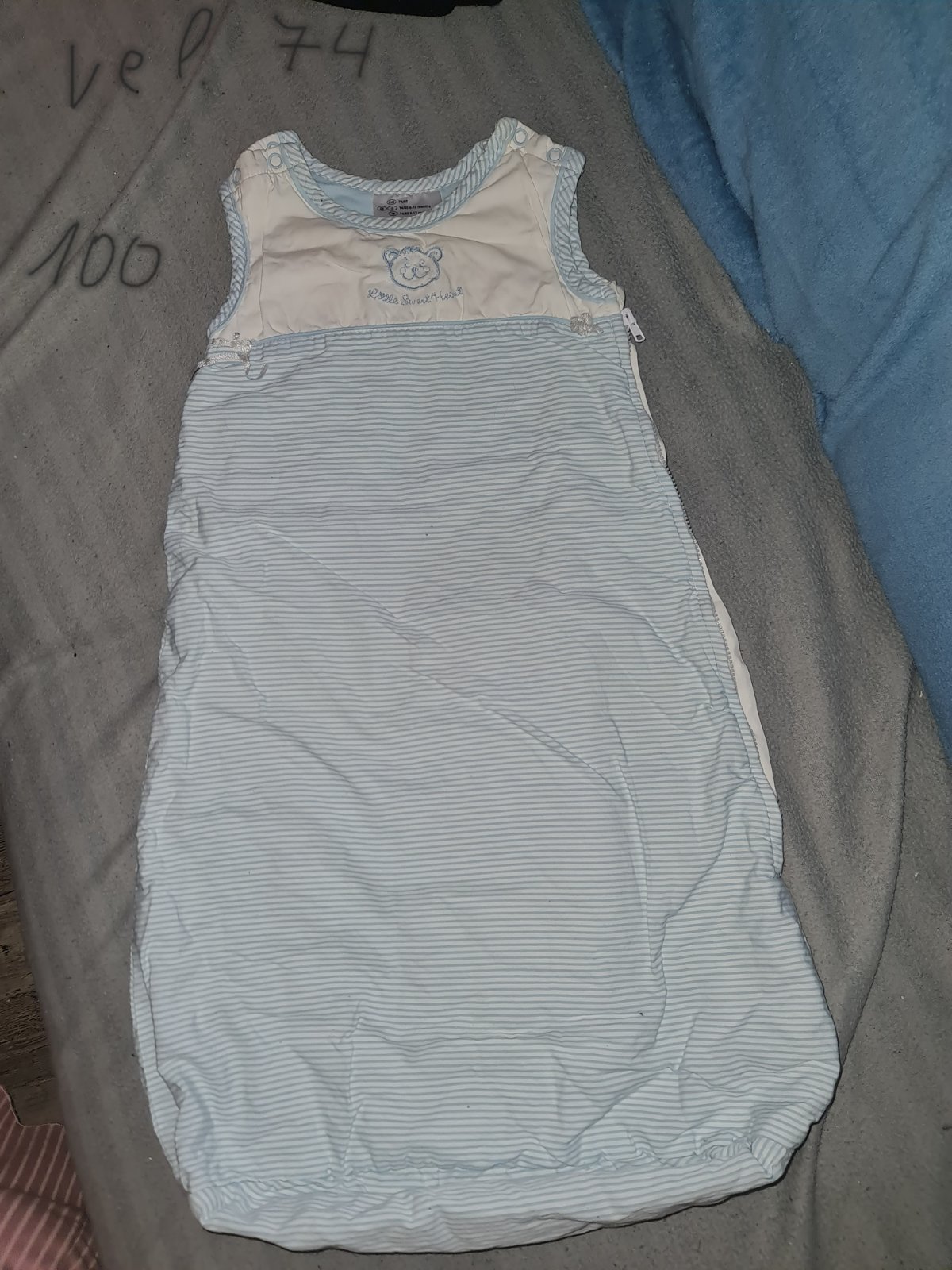 Spací tenčí pytel, vel psaná 74/80,ale syn v něm byl max do půl roku a už mu byl těsnější. Drobné známky používání nese, ale je bez fleku, děr, zip i patenty funkční, není sepraný.