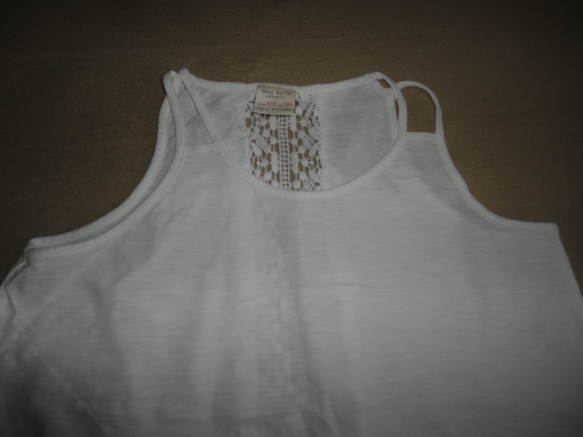 Suprové, pozdě dovezené, jako nové bavlněné tílko/top, barva bílá, střih do A, dvě špagetová ramínka, vsadka z krajky v zadním díle, velmi elegantní, d. 52cm, š. v průramku 40, dole až 60cm, lehce dokulata