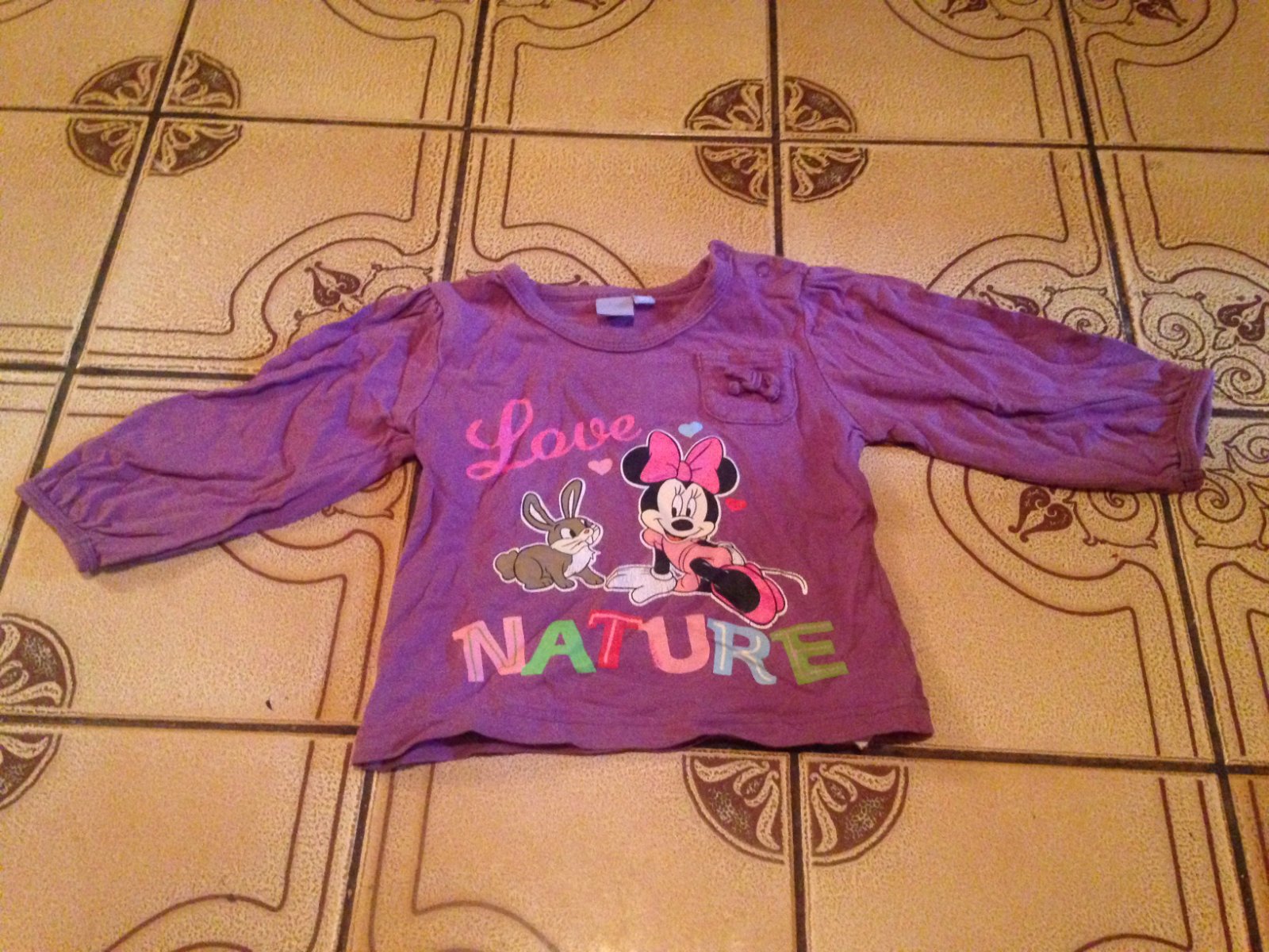 Prodám halenku v pěkném stavu, značka: Disney, velikost: 68 - 74, složení: 100 % bavlna, má počínající prací chloupek, sem tam obrázek jemně popraskaný, vyfoceno, cena tomu přizpůsobena. Cena halenky je: 39 Kč + poštovné. Krabice č. 36.