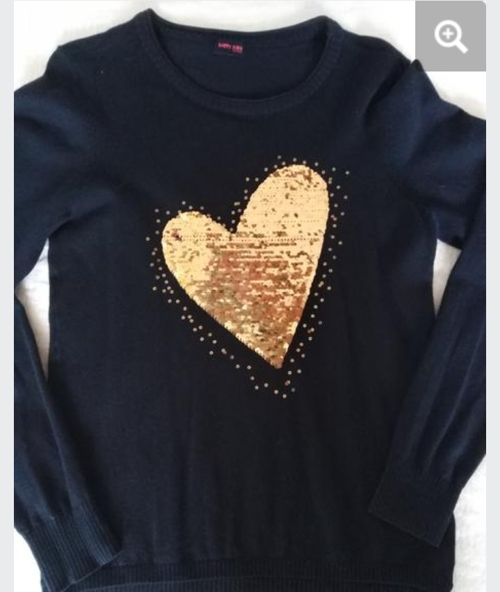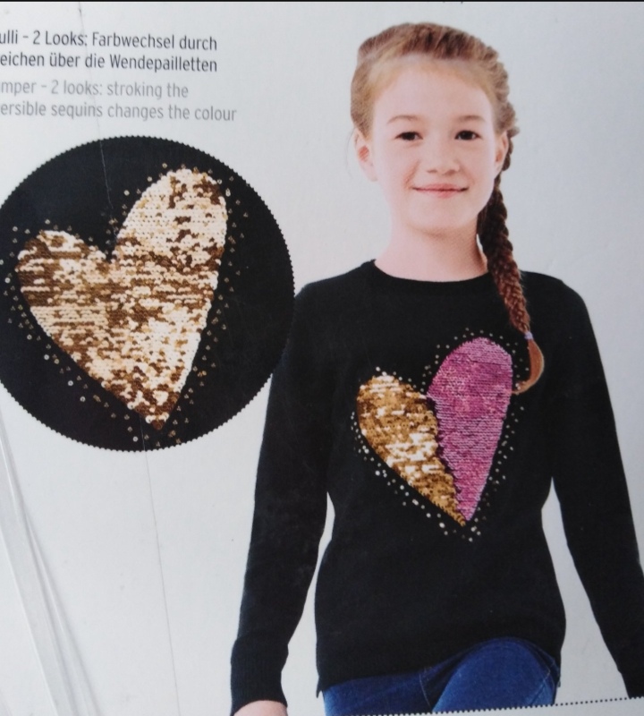 Prodám krásný NOVÝ dívčí pulover Tchibo s oboustrannými pajetkovými srdíčky