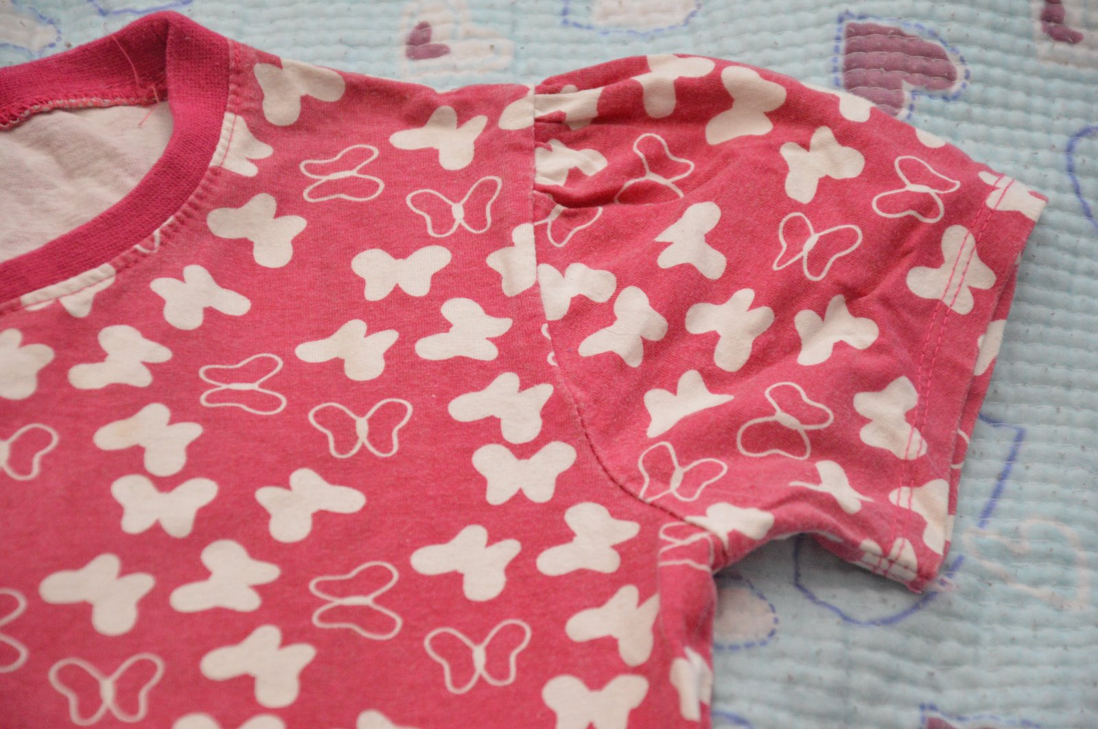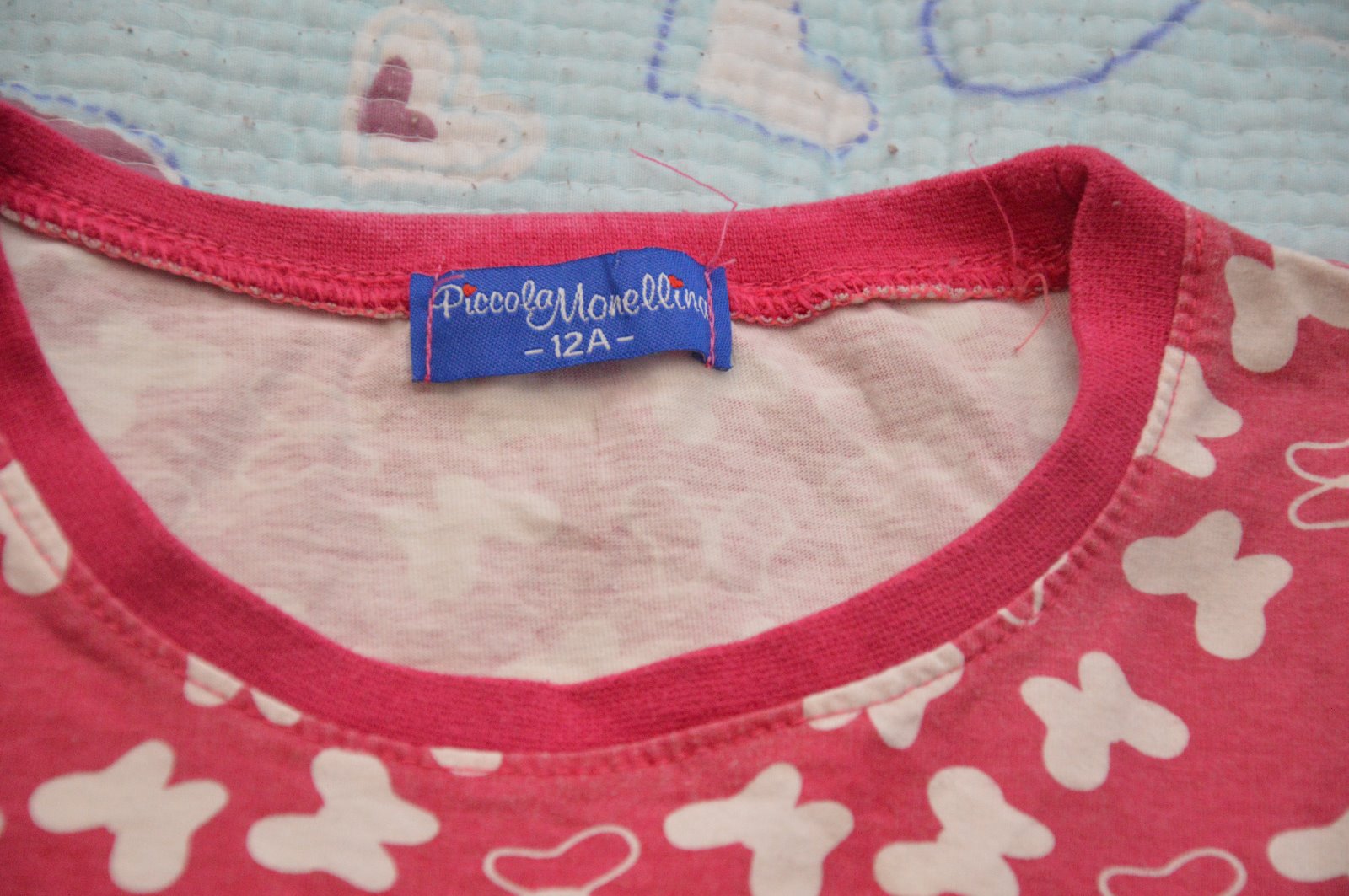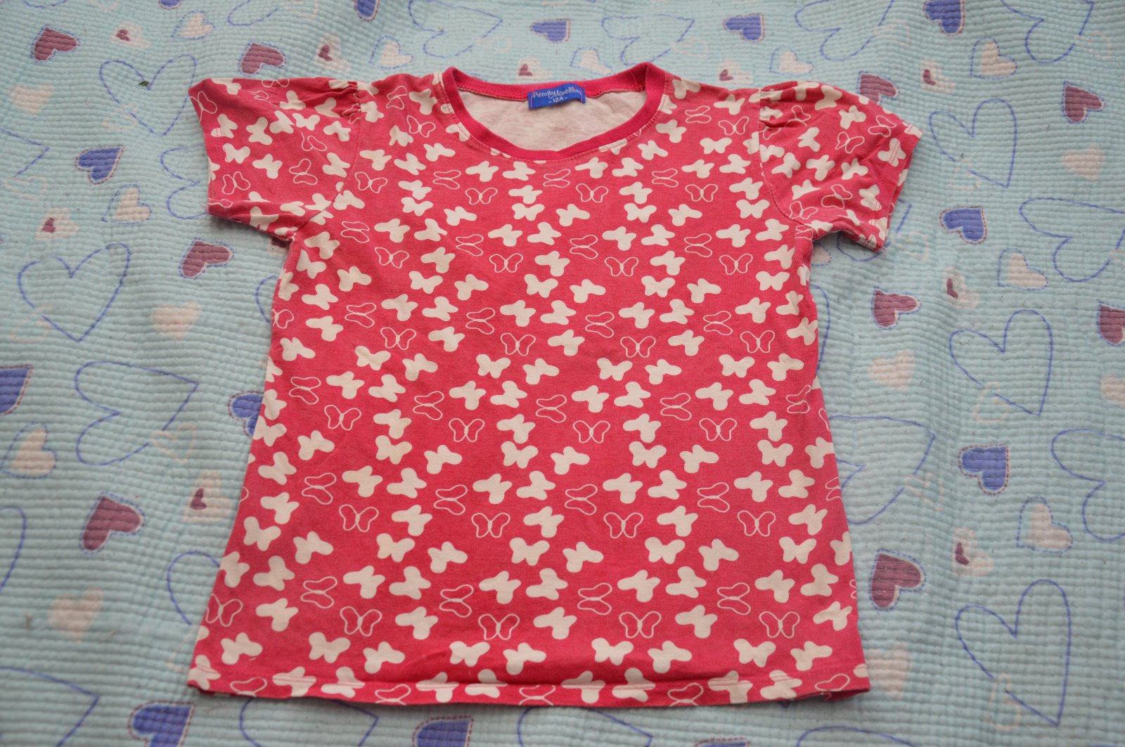Praktické bavlněné tričko s potiskem motýlků. 100% ba, vel. uvedena 12A, zn. Piccola Monellina, barva růžová, malinově červená, lehce oprané jinak bez vad. Doporučuji. Délka 51cm.