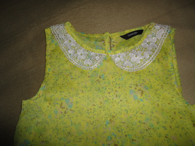 Nevyužitý, pozdě dovezený topík ke krátkým legínám nebo na plavky, jemný šifón, dvouvrstvý, takže neprosvítá, stupňovité vrstvení, vpředu kratší, u krku hačkovaný límeček, vzadu slzička na knoflíček, střih mírně do A, velikost 1128/134, ale měřte, d. 48, vpředu, vzadu 54cm, š. v průramku 33,5, š. ramen 26, š. dole cca 42cm