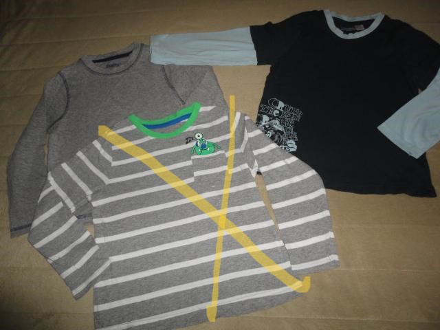 Hezká školková trika. *Triko šedé, jako nové, nevyužili jsme, zdobné štepování,vhodné i pro vrstvení nebo v zimě pod svetřík, d. 43, š. 35, rukáv od krku 50cm, cena 40Kč. ***Tmavo modré triko vrstvený efekt, vpředu a částečně i vzadu bezchybný potisk, supr stav, d. 46, š. 36, rukáv od krku 48cm, cena 40Kč, celkem 70Kč