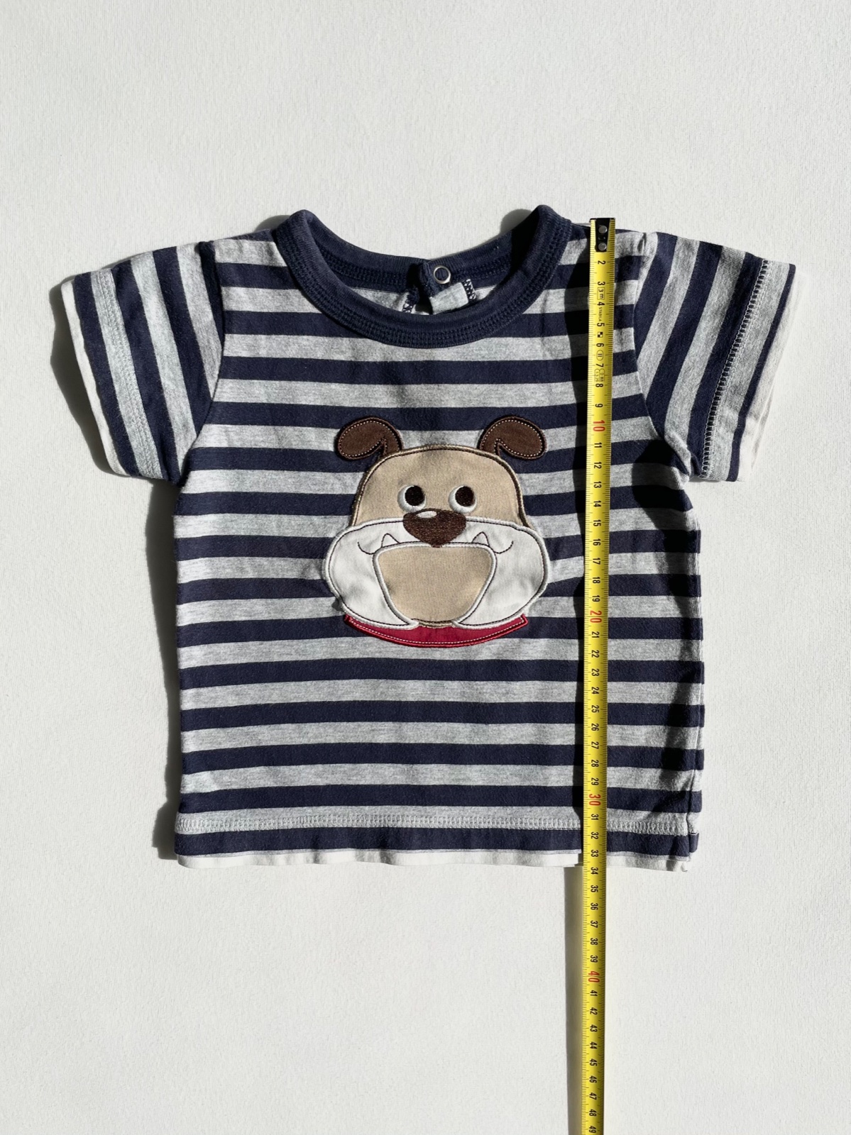 Málo nošené, měkké triko pólo s pruhy, materiál bavlna, boční rozparky, vpředu decentní výšivka, vel. 80, rozměry d. 31, š. 31cm, ramínka 22, rukáv od ramen 11 cm