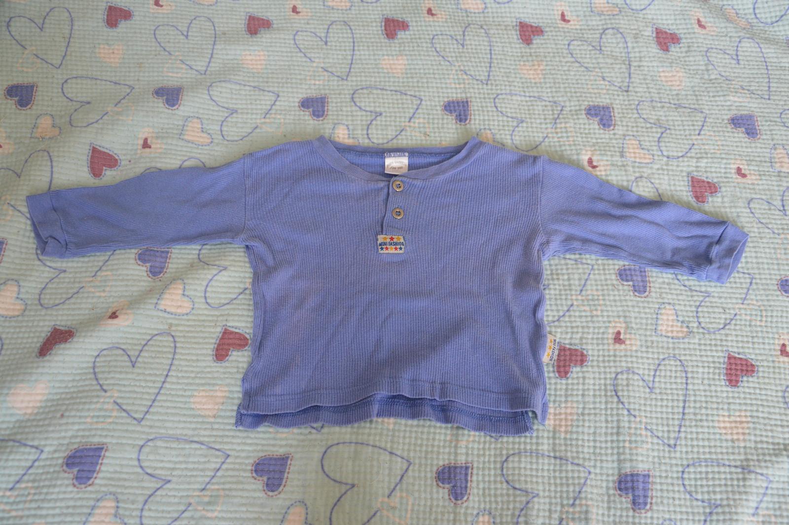 vel psaná 74/80, mne příjde spíš 80/86, zn. Mini Fashion for you, měřte: délka 29,5 cm, š. 30 cm, rukáv 23/29cm, hodně nošené, bez vad.