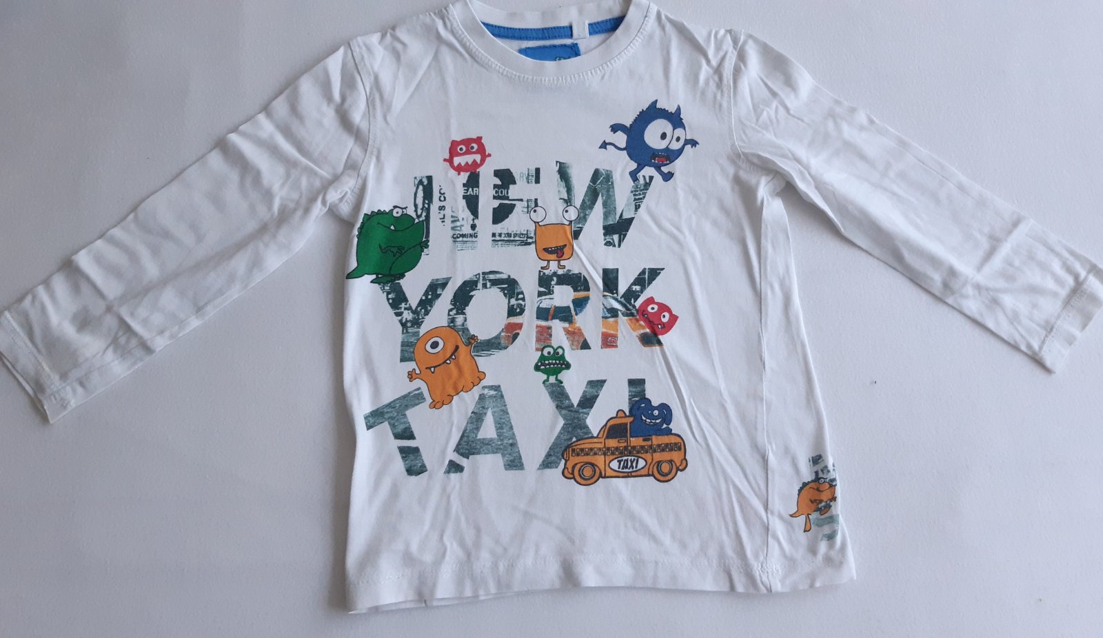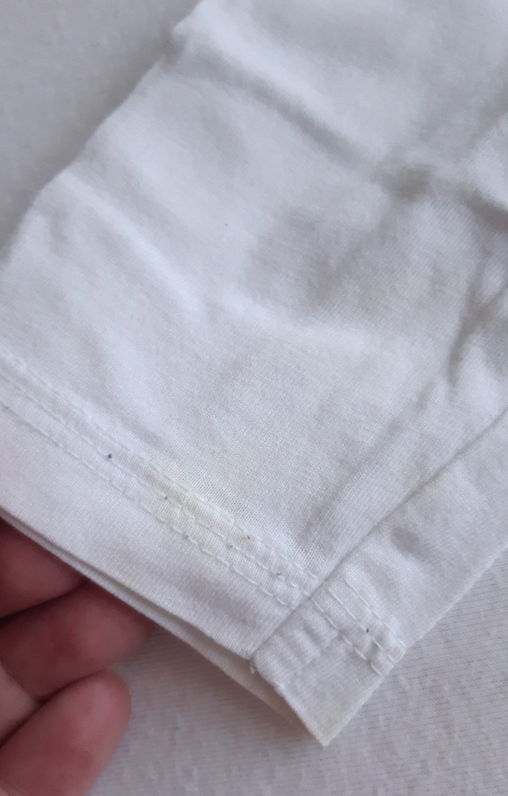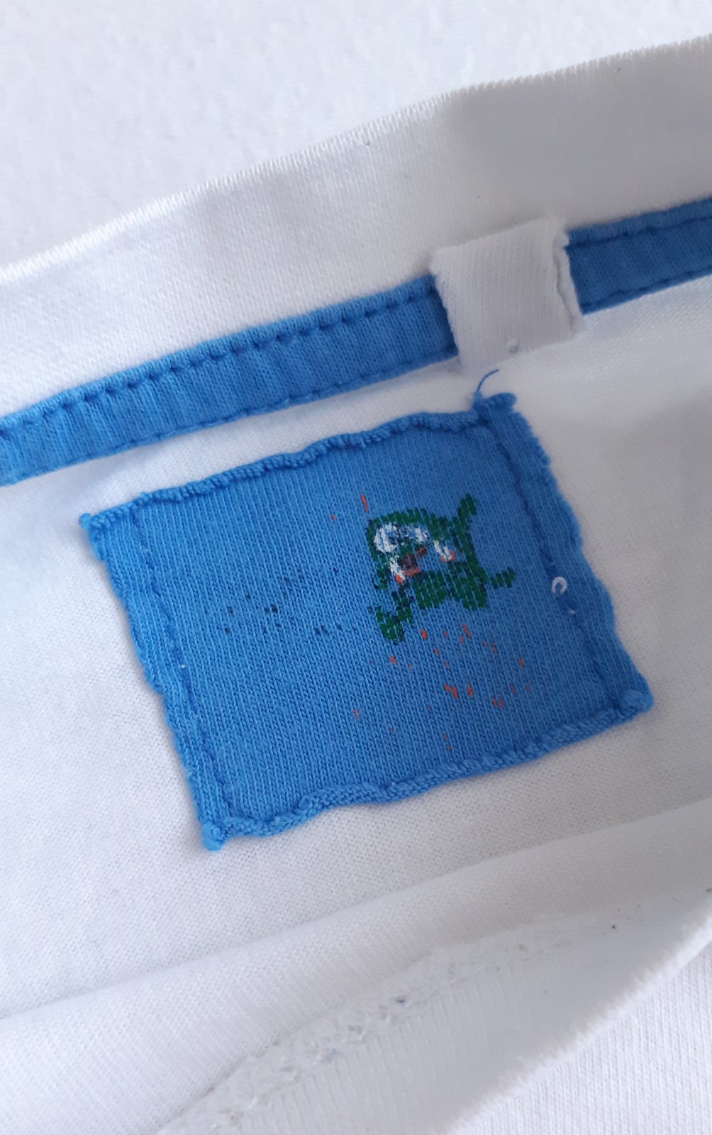 Bílé triko s nápisem po více dětech. Bez dírek, lehce nažloutlý flíček na rukávu.