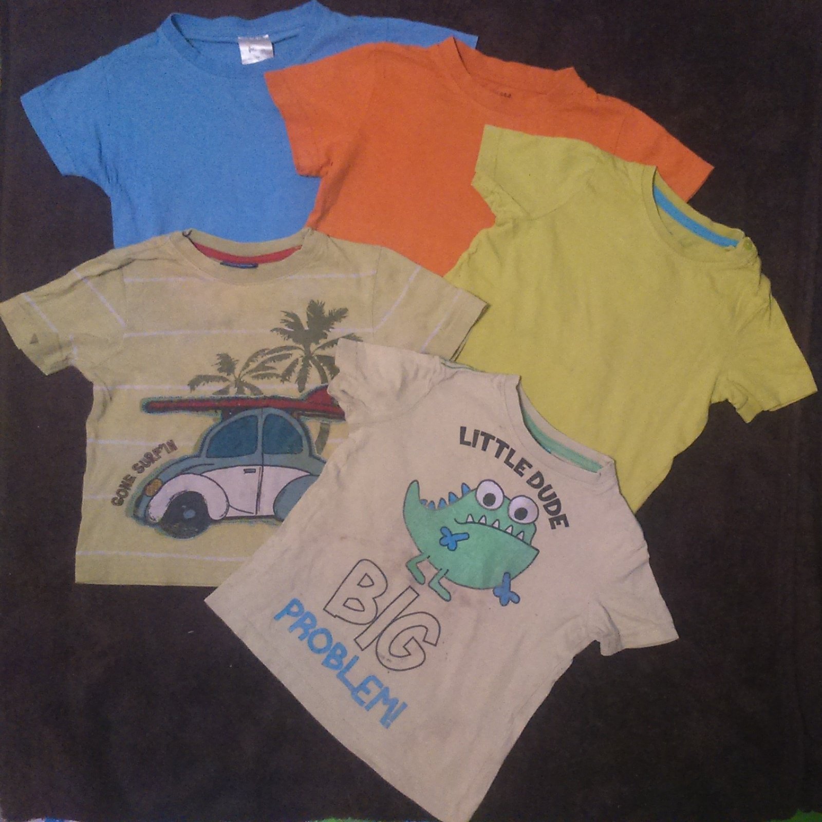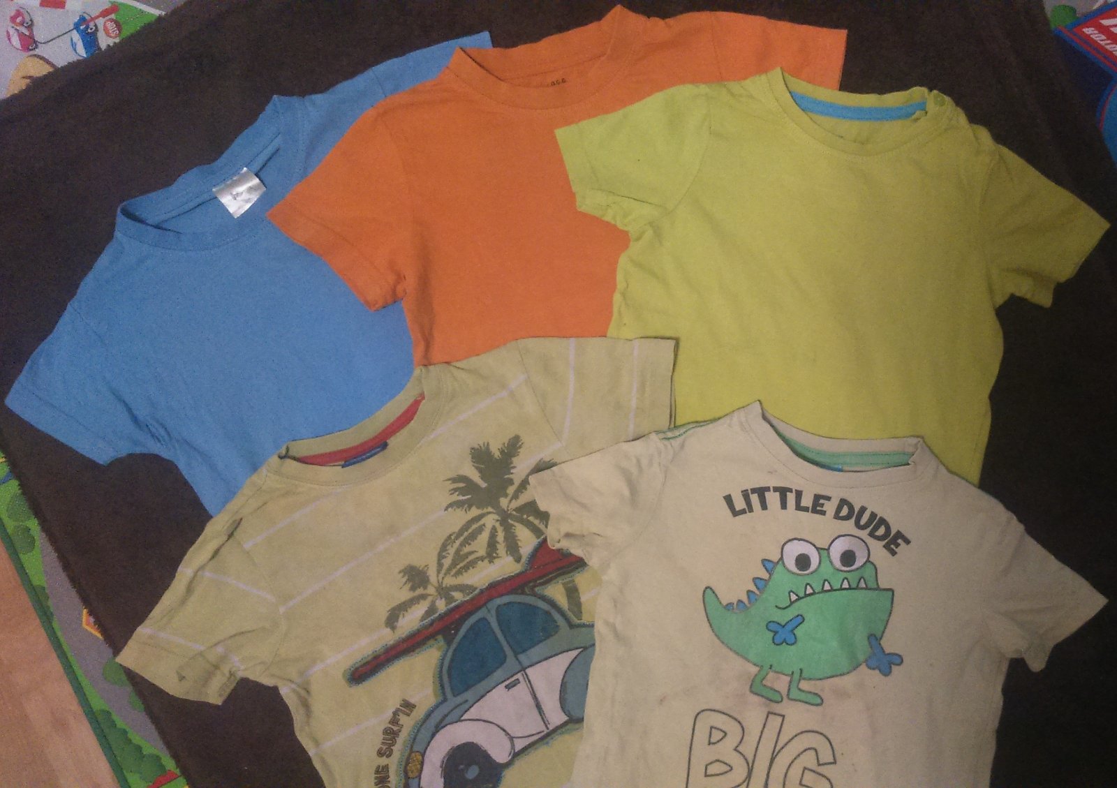 Trička málo nošené modré a oranžové, na ostatních se najde drobný flíček, jinak bez poškození