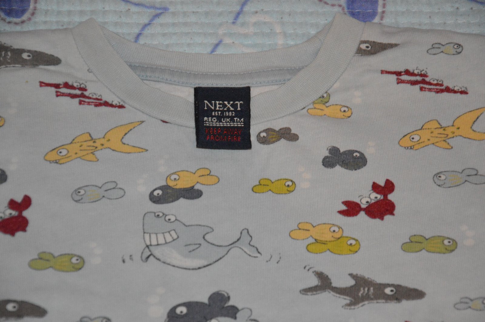 bavlněné triko dl. rukáv s rybami a žraloky, 100% bavlna, zn. Next, vel. 104, odpovídá. Běžné známky nošení, bez vad.