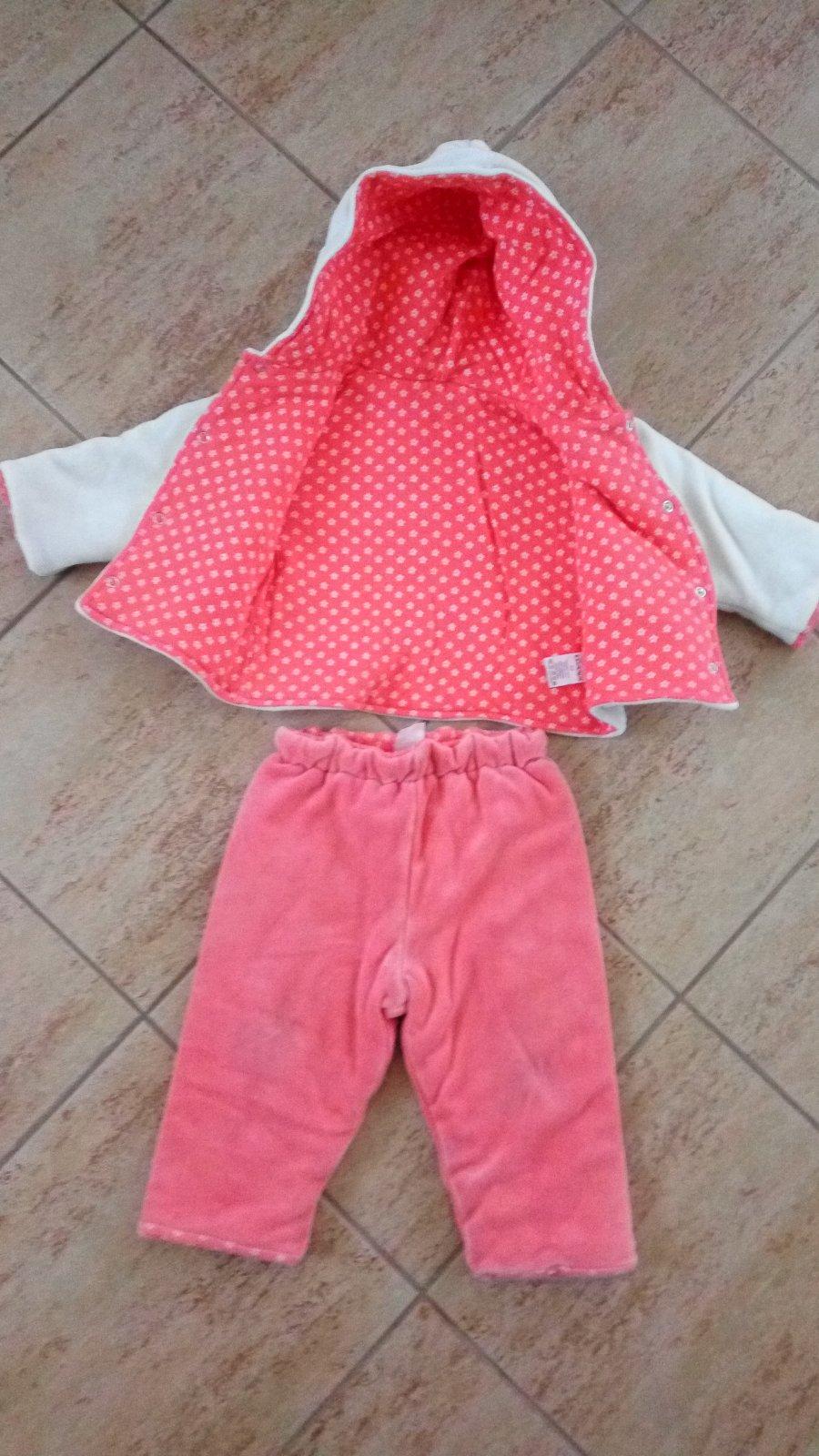 Velmi pěkná hřejivá zimní soupravička pro holčičky. Souprava obsahuje kabátek ve smetanové barvě s motivy kytiček a zateplené kalhoty v barvě lososově červené. Souprava je od zn. Loana a udaná vel. je 62., ale určitě ji unosí i větší holčičky. Kabátek je opatřen kapucí, a je na patenty. Vrchní materiál: 80% bavlna a 20% polyester, podšívka: 100% bavlna. Soupravička je velmi dobrém stavu. Poštovné činí 95,-Kč (doporučený balík). V případě zájmu mě prosím kontaktujte.