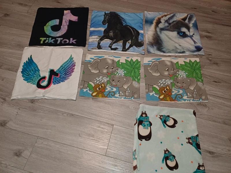 Povlak s motivem Tiktok, koně a Husky má rozměr 43×43 cm, zapinani na zip. Jsou z Ali. Cena 10 Kč/ks. Povlak se slony a opicí má rozměr 41×35 cm. Mám 2 stejne kusy, z Vesny, bez zapínání, vložení uprostřed, viz foto. Flausovy s medvědy 40×35 cm, na zip, ale chybí jezdec. Zdarma.