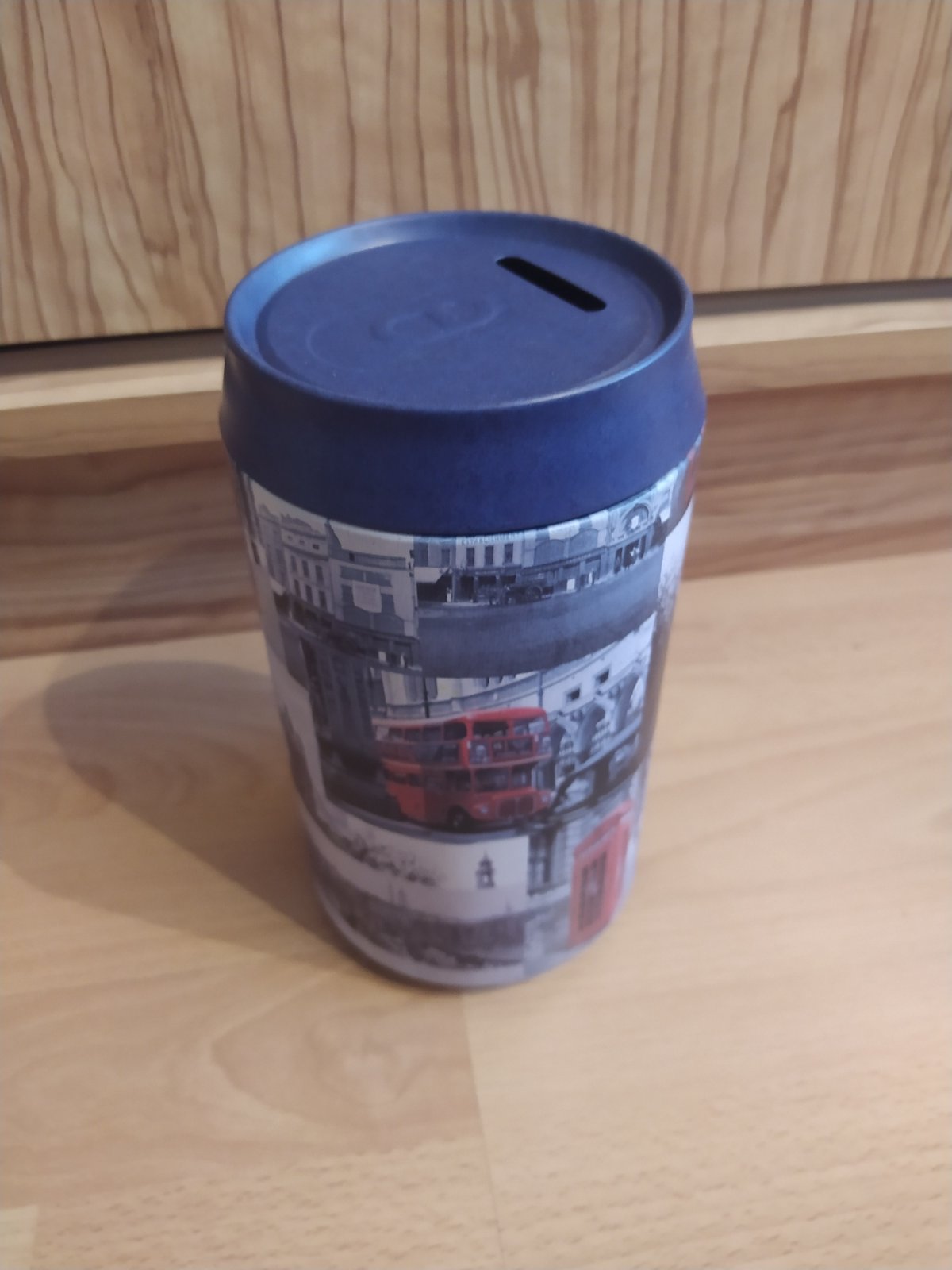 Plechová pokladnička s motivem Anglie, výška 20 cm, průměr 10 cm, Na dně vidět malé prohlubně.