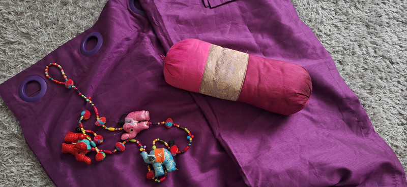 Polštářek rozměr dl.34 cm, prům.10 cm. Závěs š. 142 cm x dl.245cm. Jako nové. K tomu dekorace s motivem slonů. Ph osobní odběr, nebo zašlu Zásilkovnou za 80,-.