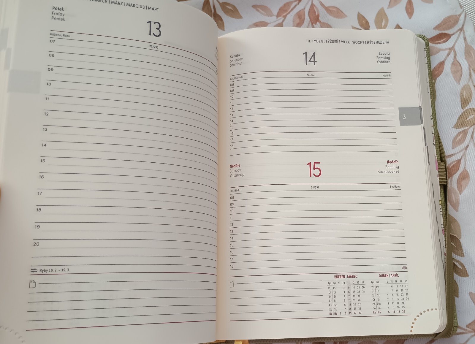Denní diář Diamante 2026 v olivové barvě. Povrch diáře má jemnou strukturu připomínající výbrus diamantu .Diář má zakulacené rohy, poutko na tužku a elastickou gumičku.