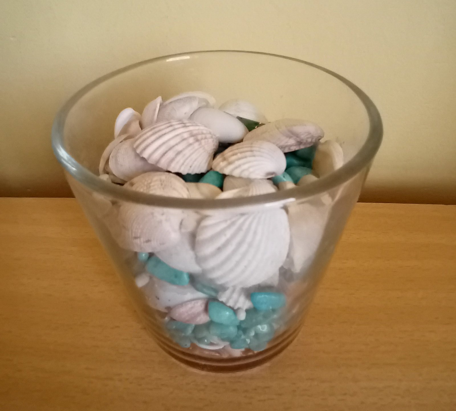 Sklenička s mušličkama a tyrkys kamínkama k dekoraci.Nahoru můžete položit svíčku.Není součástí jen na focení.Vlastní výroba.