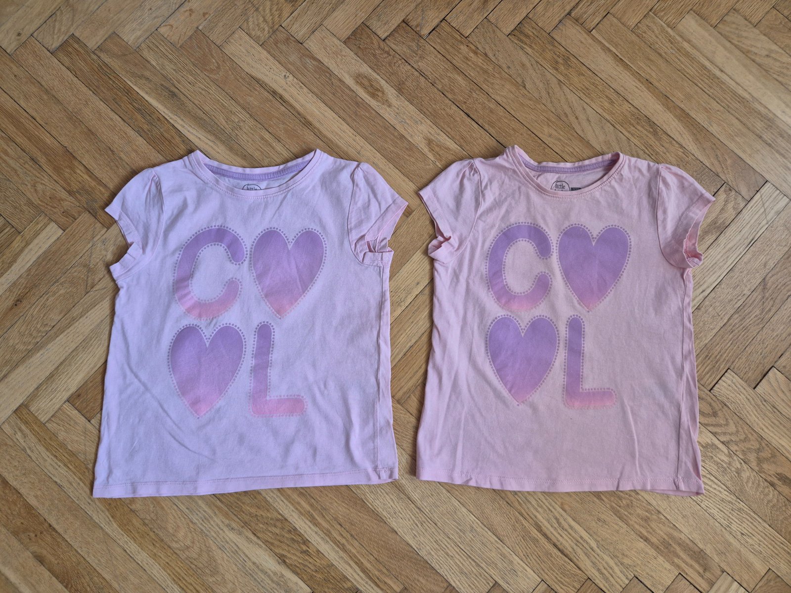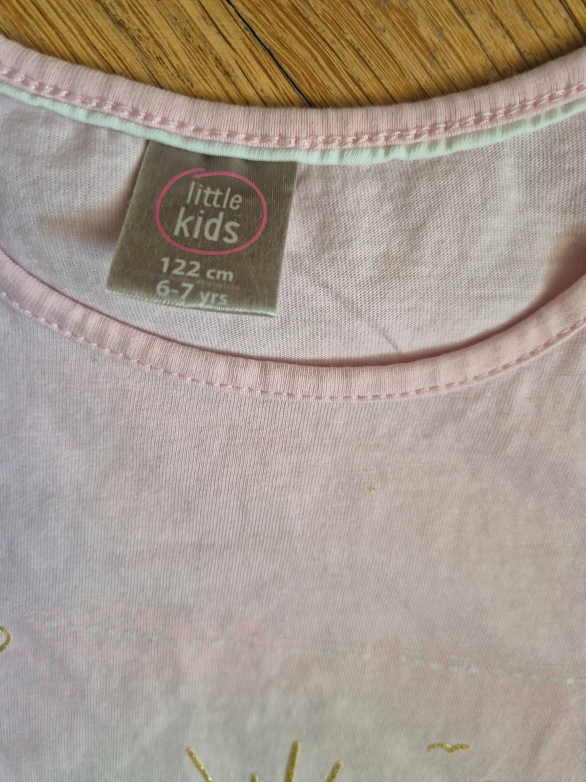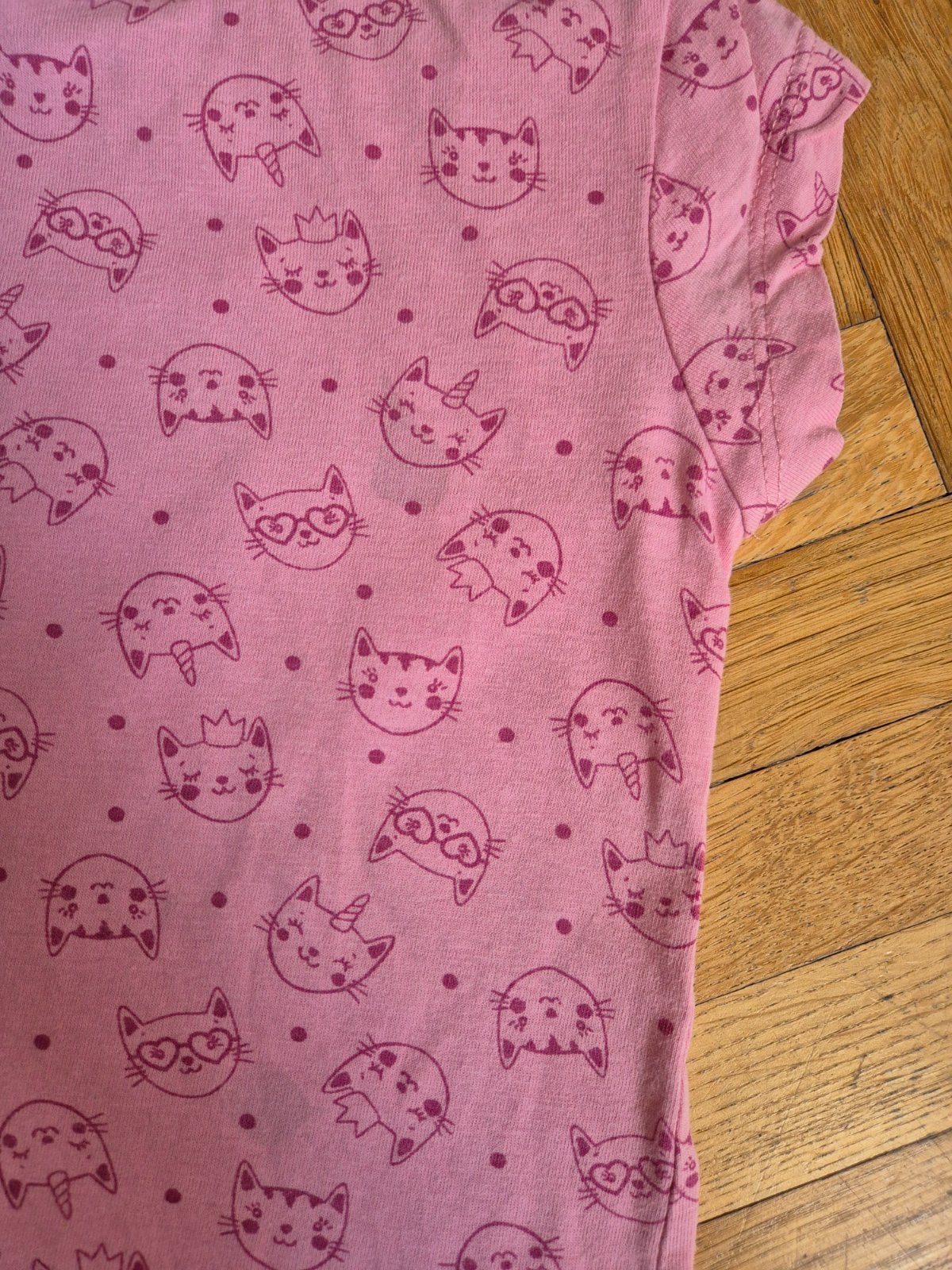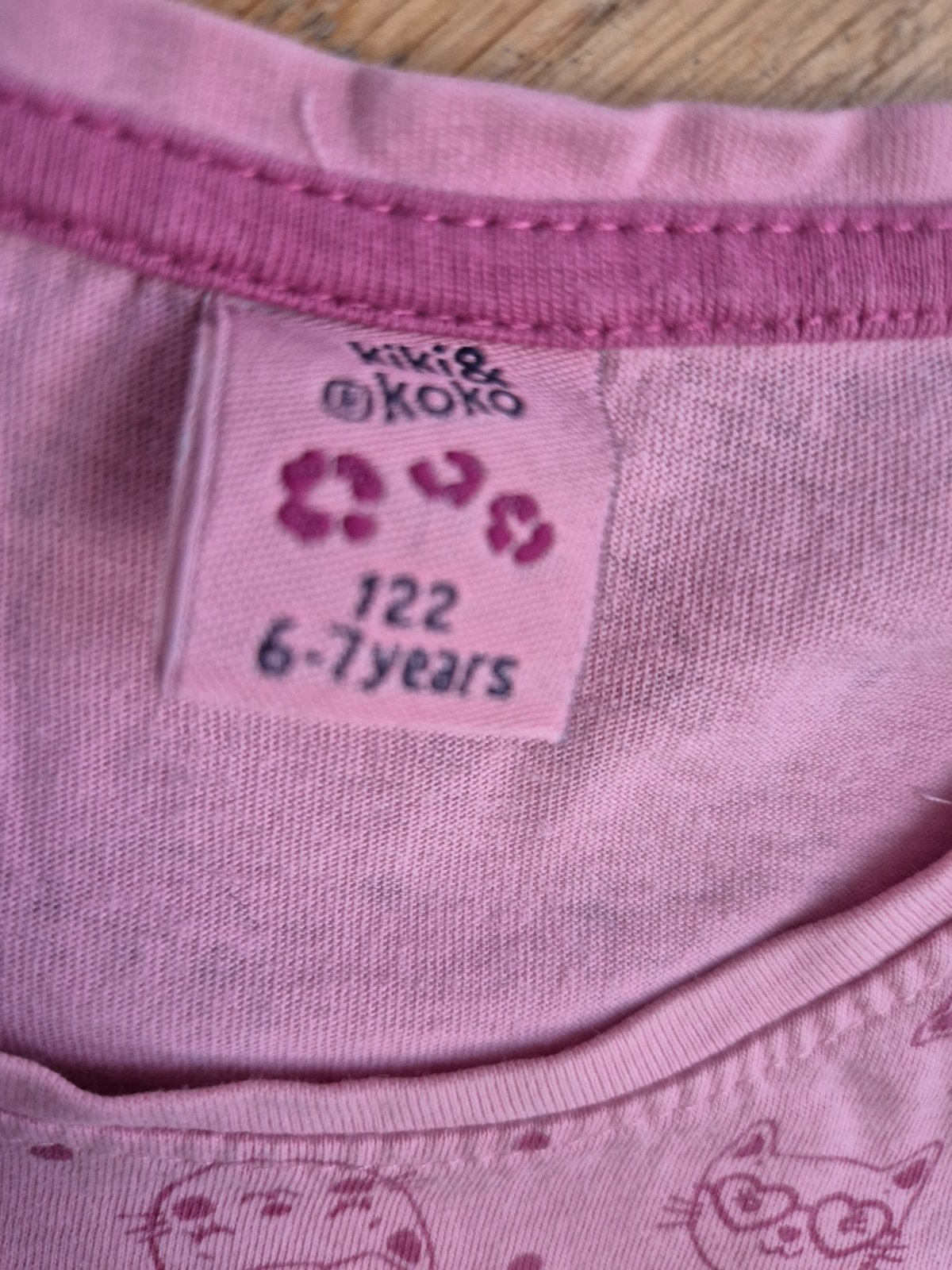 Růžová s pozdravem kočičkama a nápisem Kiki Koko 122 6-7 let, na jednom vzadu dva tmavší flíčky, zadní díl delší, D 43-46,5 cm, š 34 cm (druhé d 42-47 cm, š 32,5 cm)