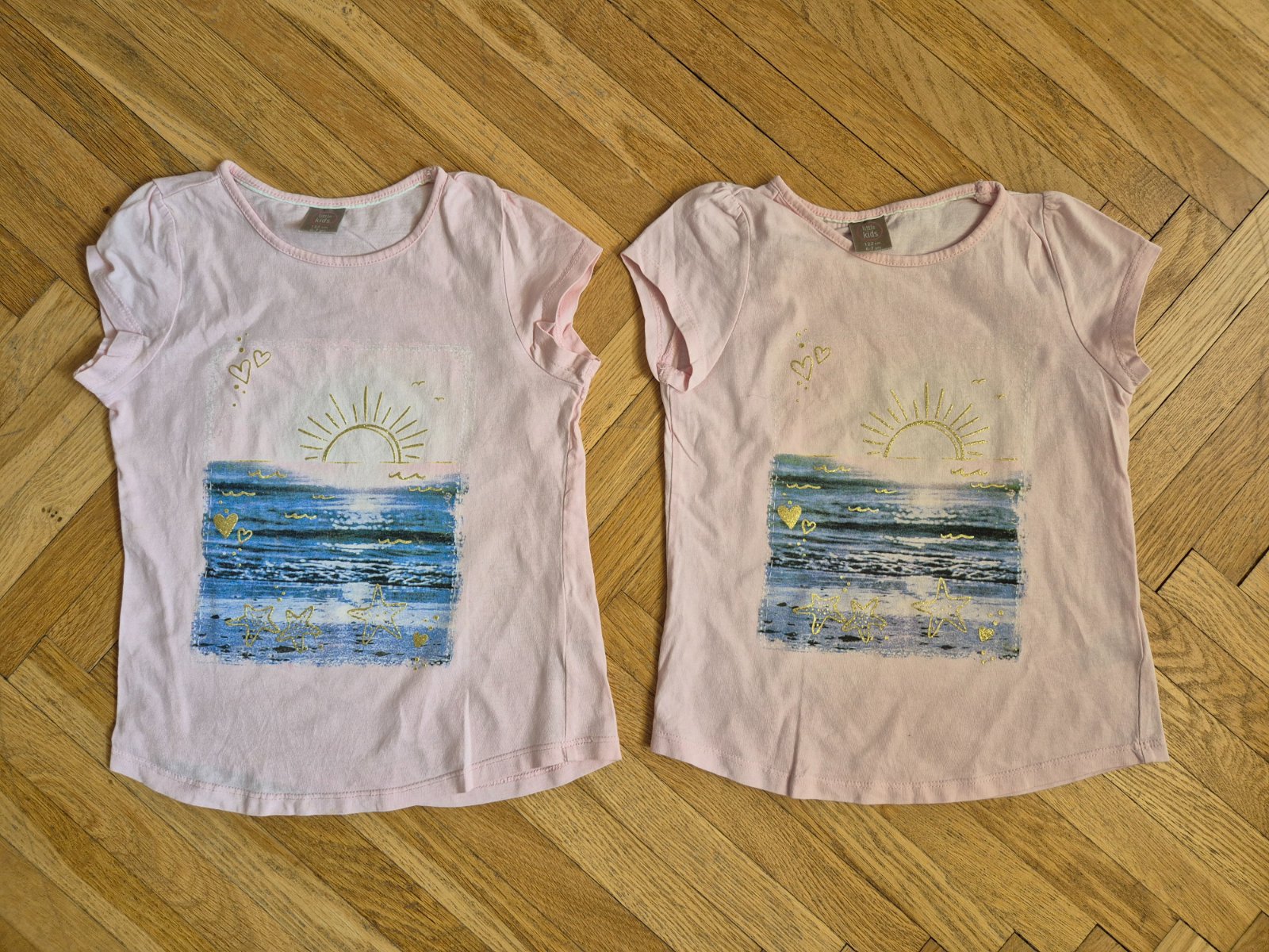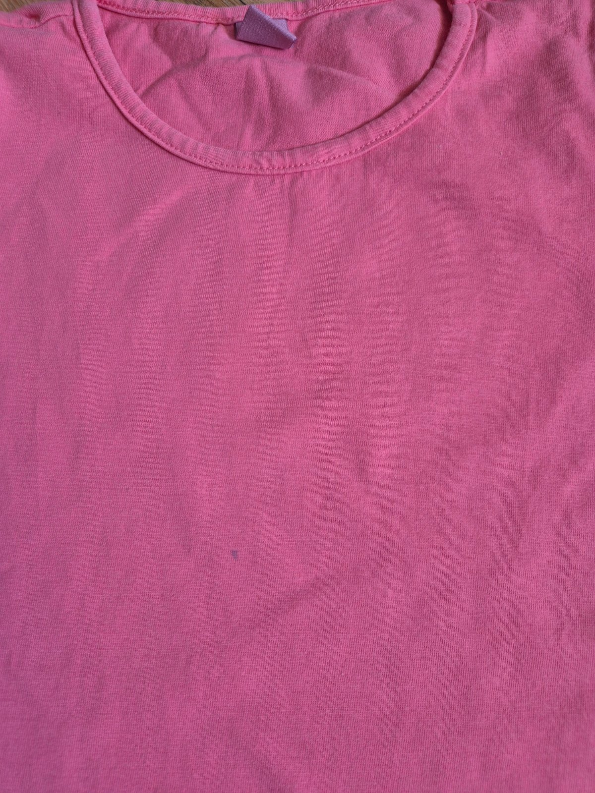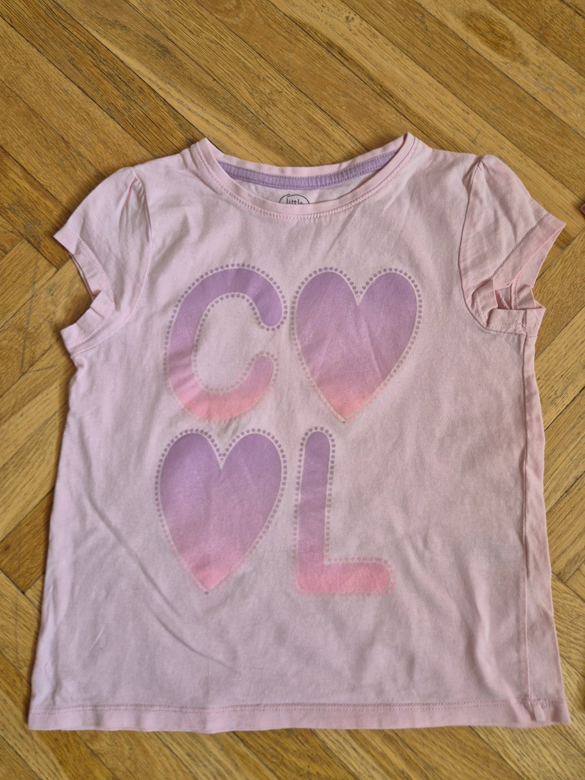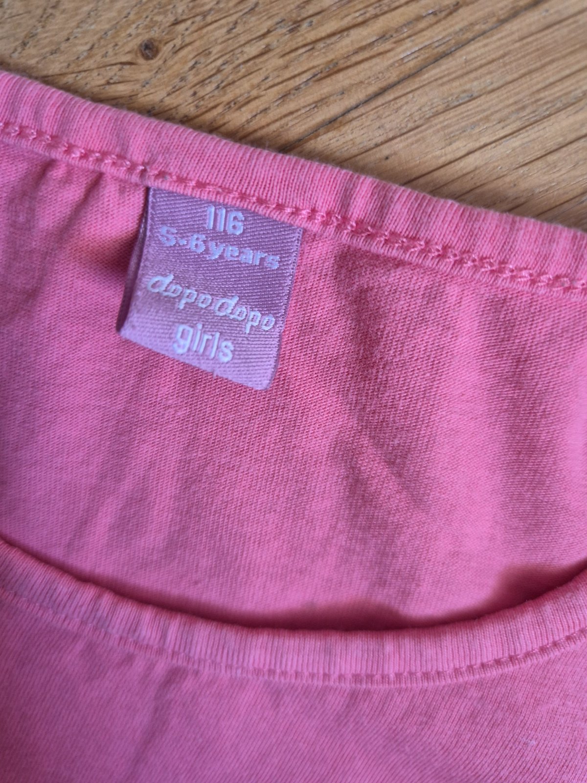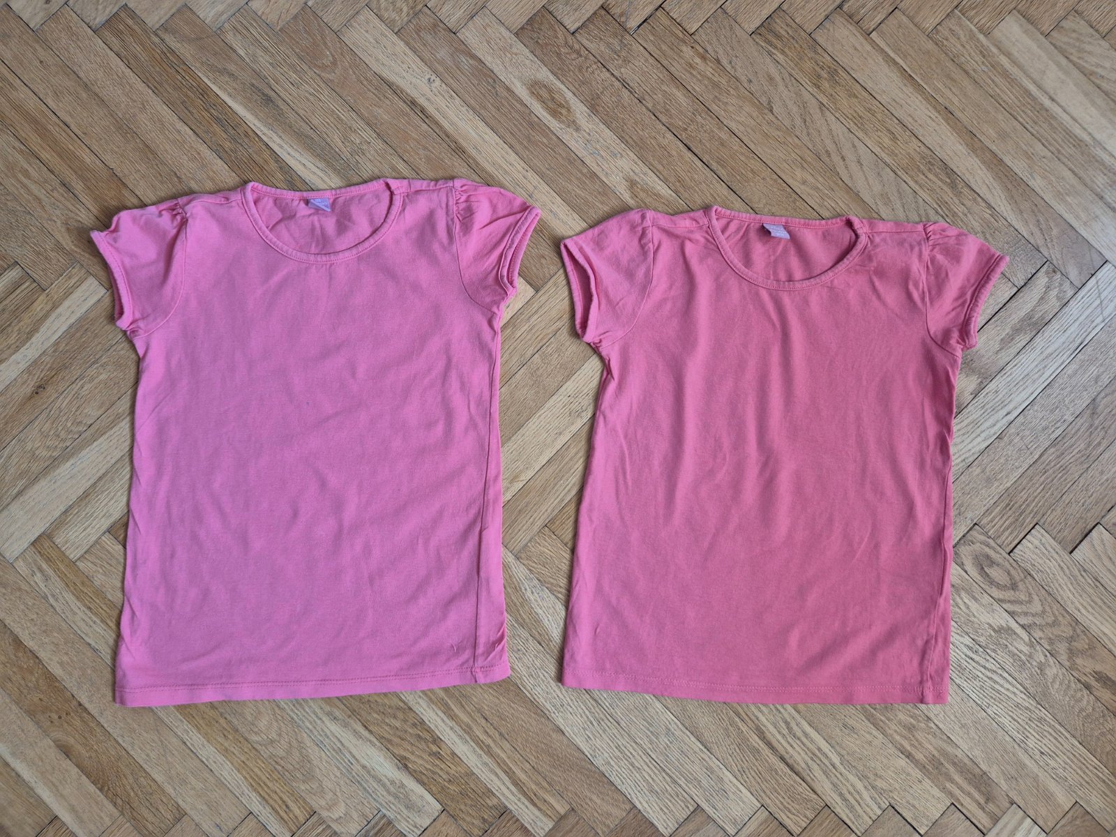 Růžová s pozdravem kočičkama a nápisem Kiki Koko 122 6-7 let, na jednom vzadu dva tmavší flíčky, zadní díl delší, D 43-46,5 cm, š 34 cm (druhé d 42-47 cm, š 32,5 cm)