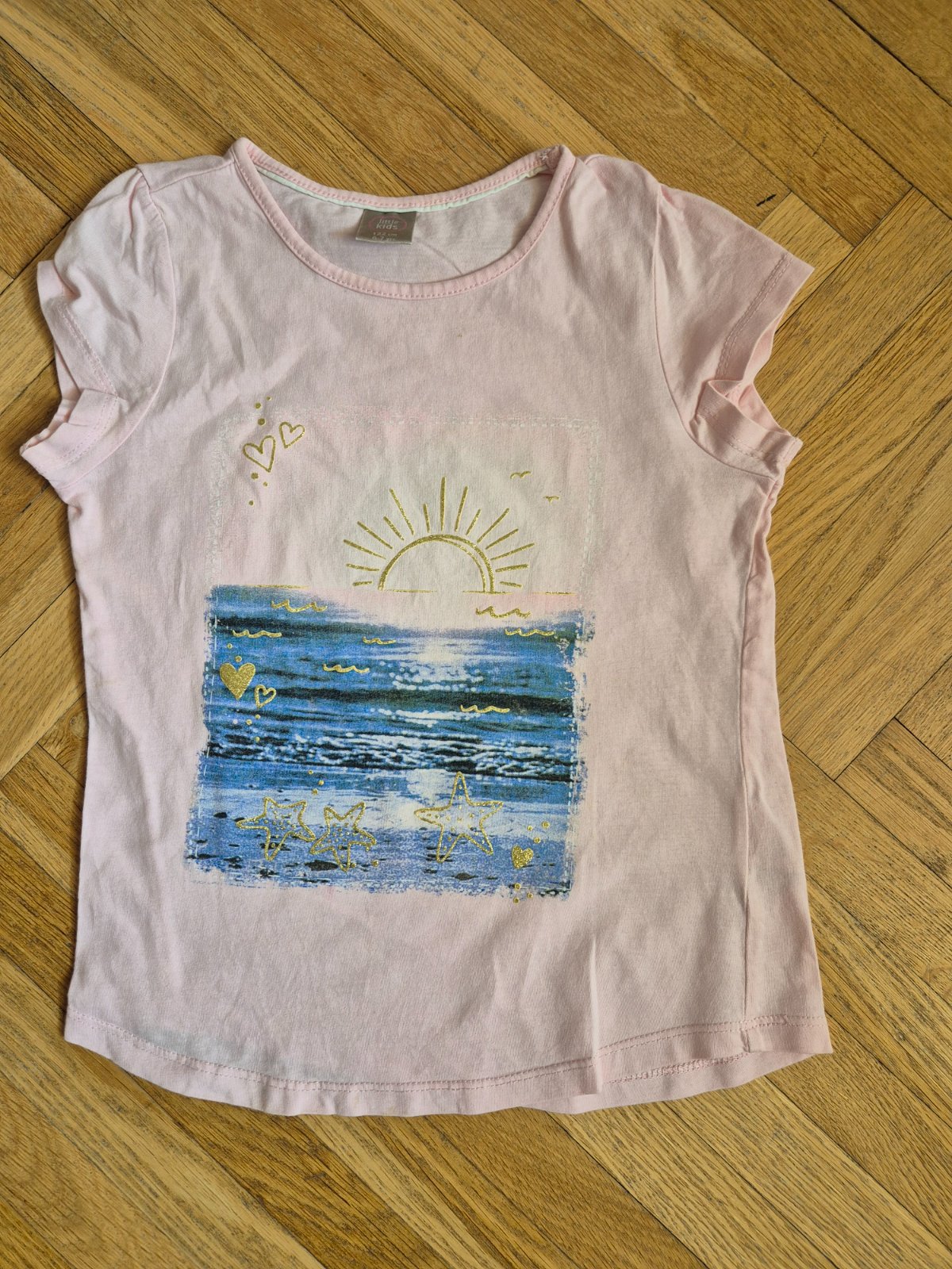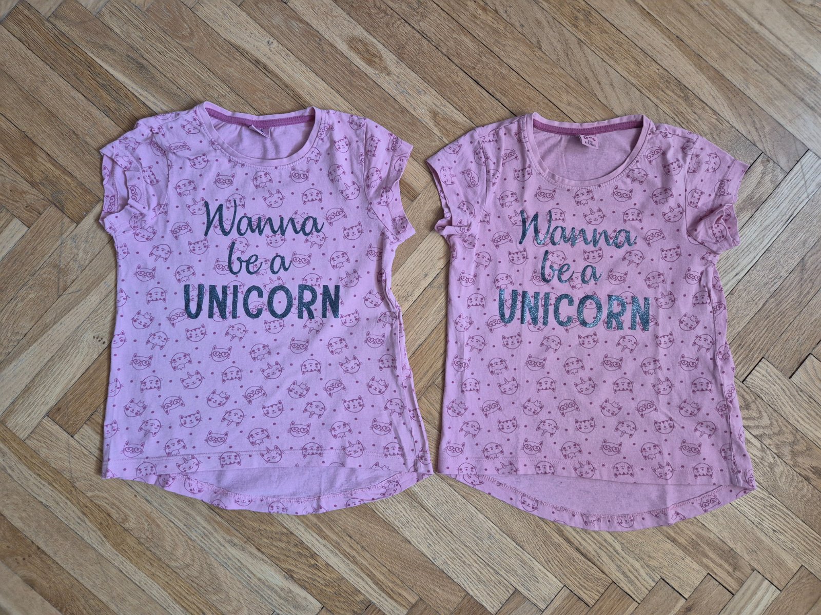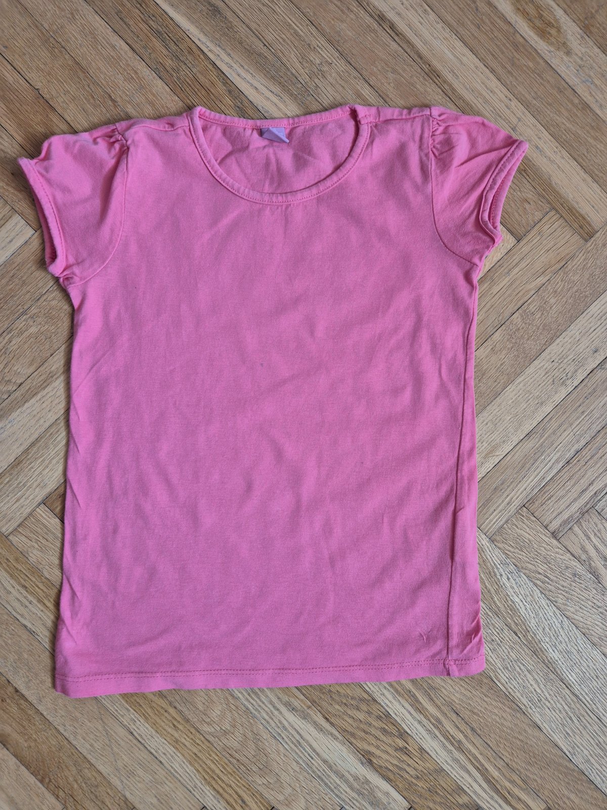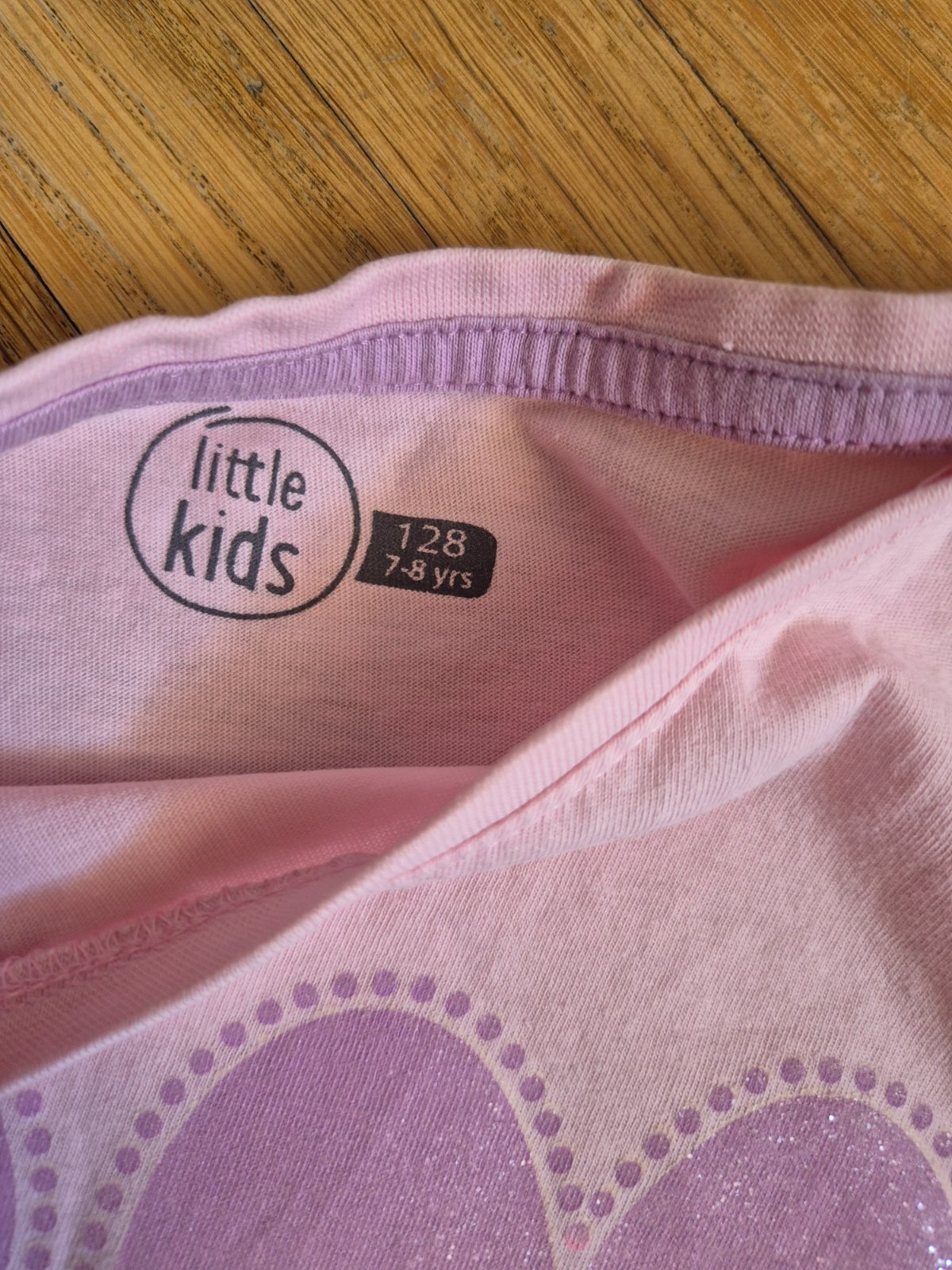 Růžová s pozdravem kočičkama a nápisem Kiki Koko 122 6-7 let, na jednom vzadu dva tmavší flíčky, zadní díl delší, D 43-46,5 cm, š 34 cm (druhé d 42-47 cm, š 32,5 cm)