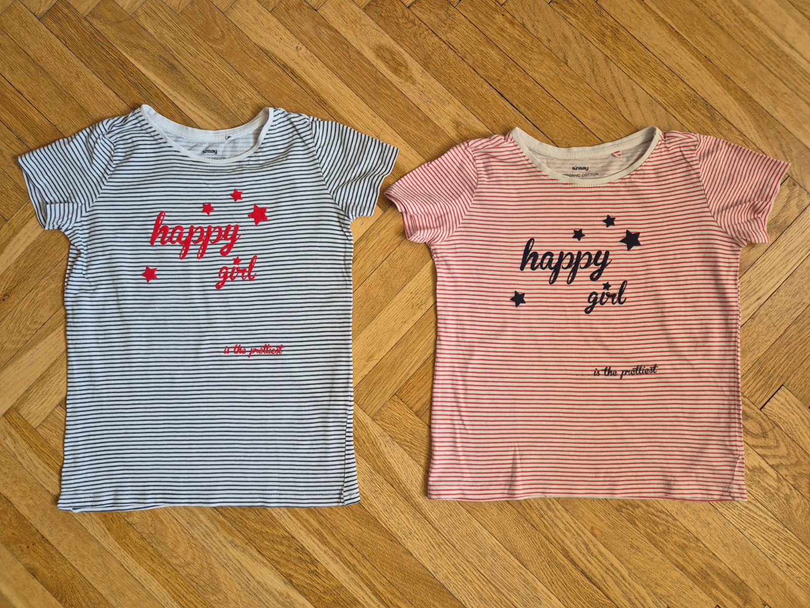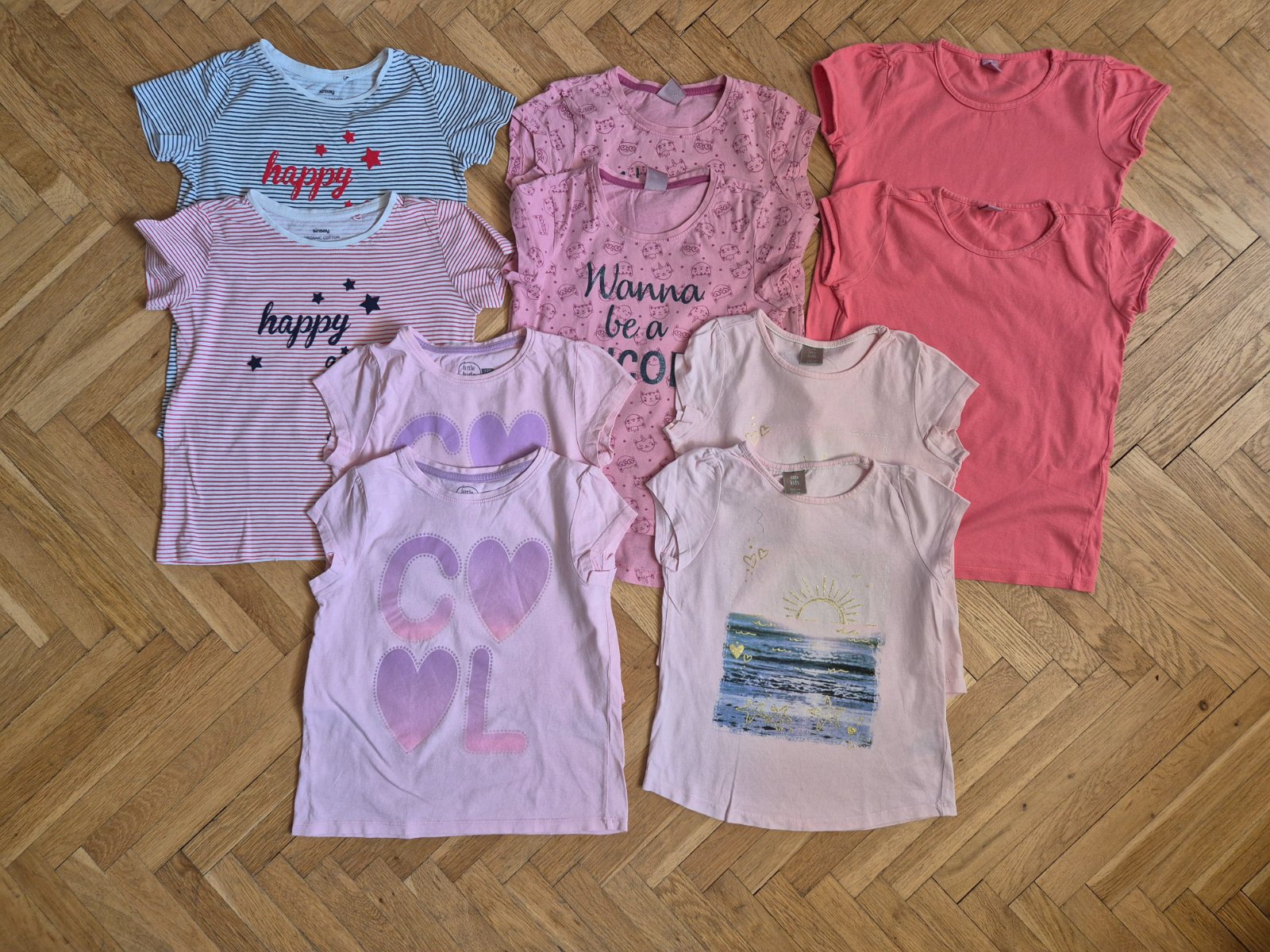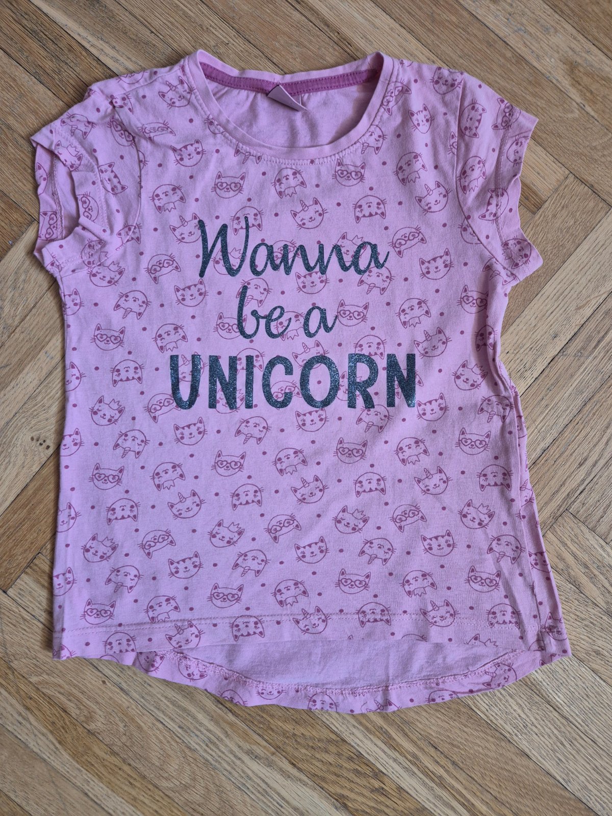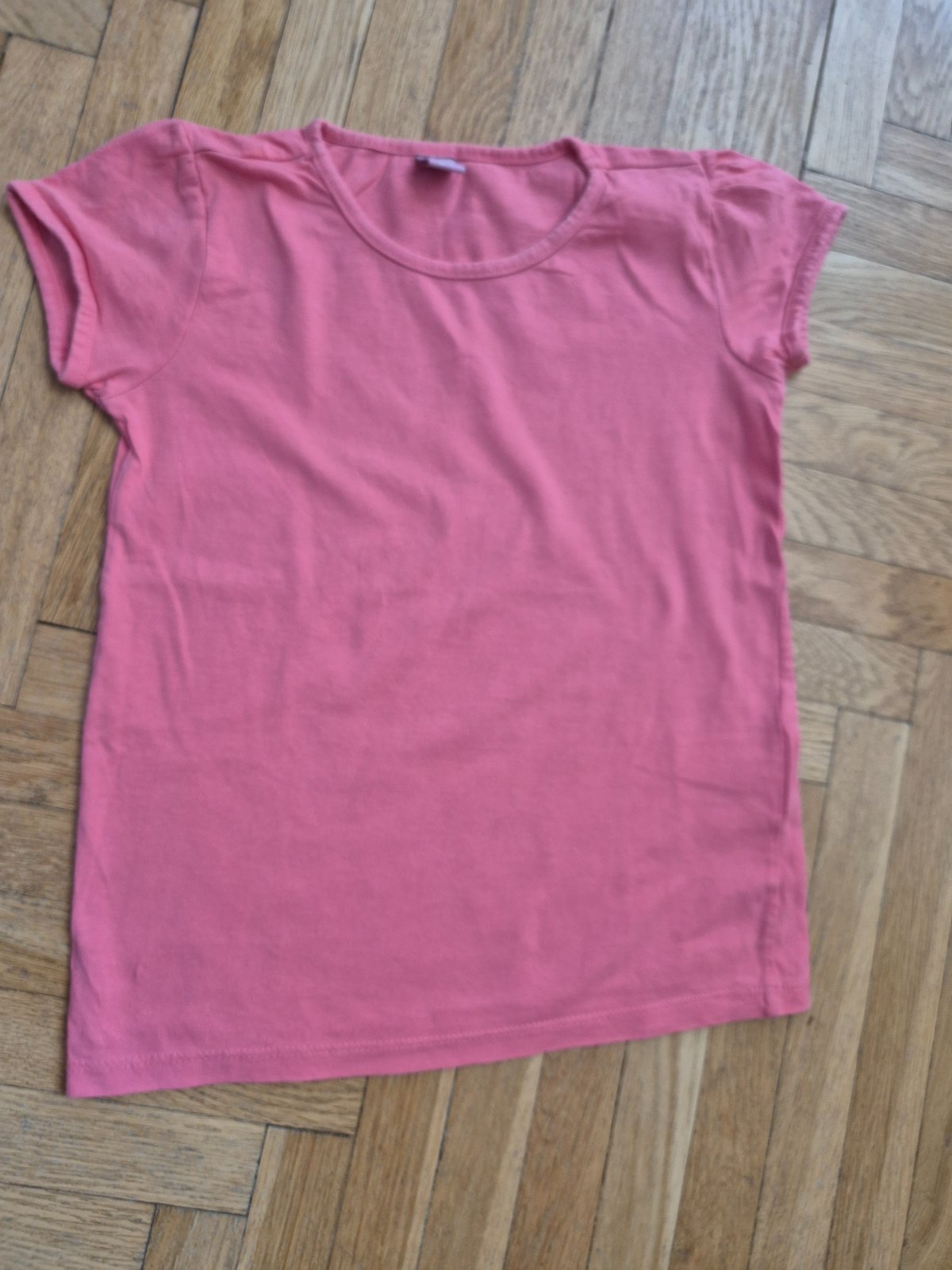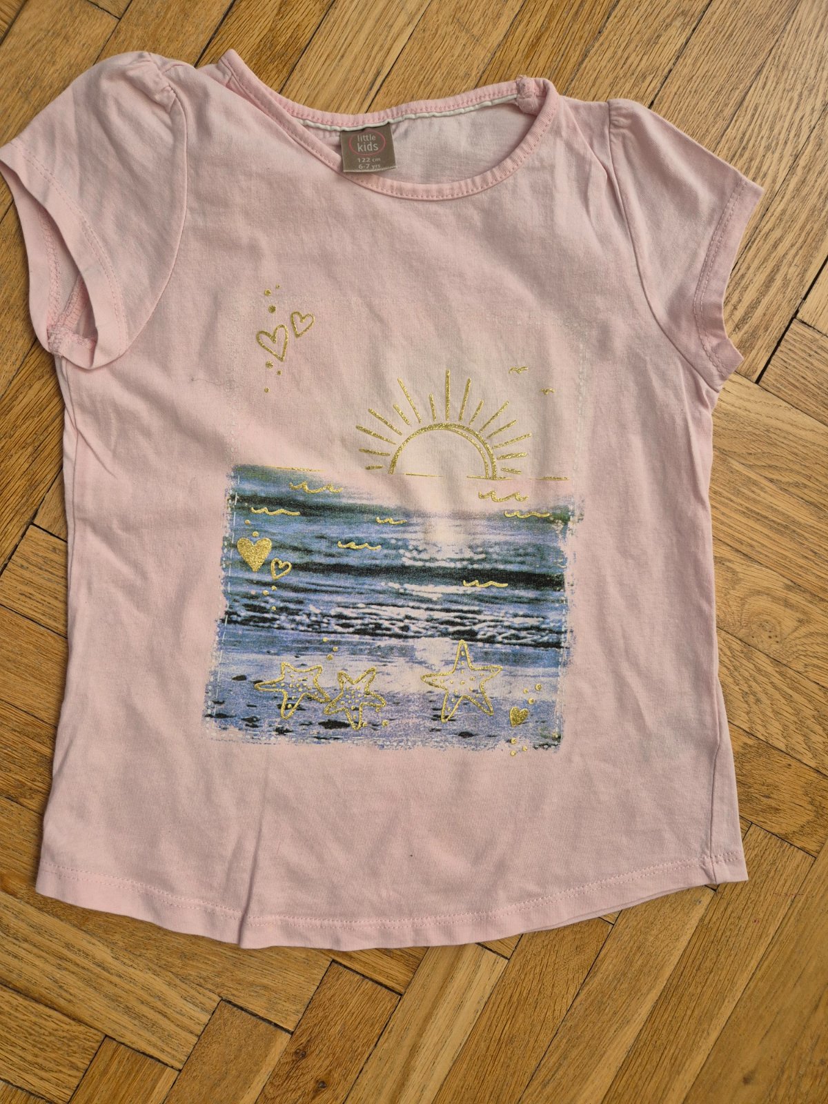 Růžová s pozdravem kočičkama a nápisem Kiki Koko 122 6-7 let, na jednom vzadu dva tmavší flíčky, zadní díl delší, D 43-46,5 cm, š 34 cm (druhé d 42-47 cm, š 32,5 cm)