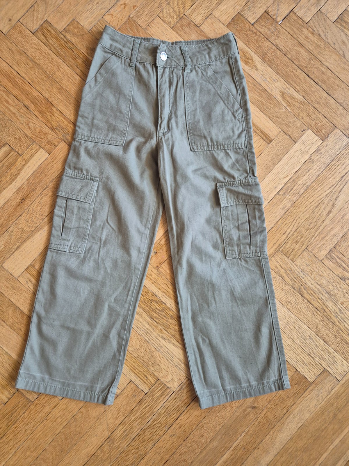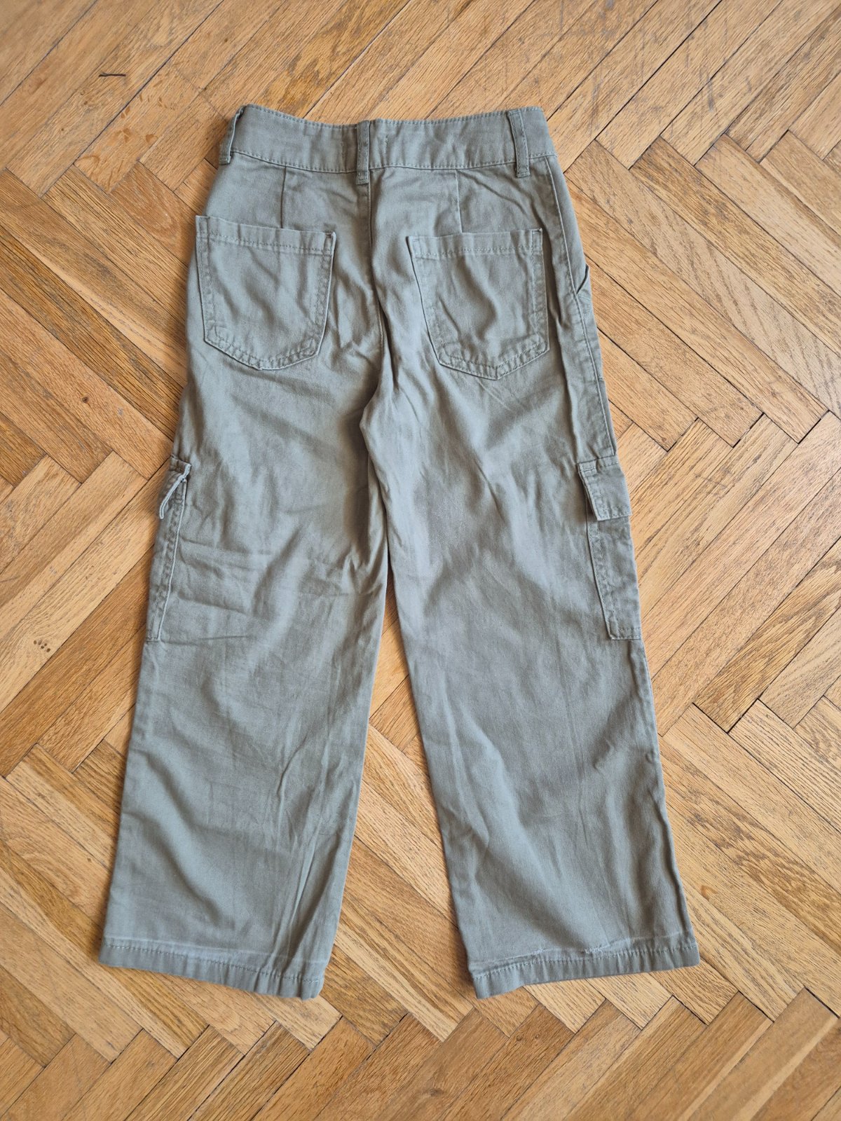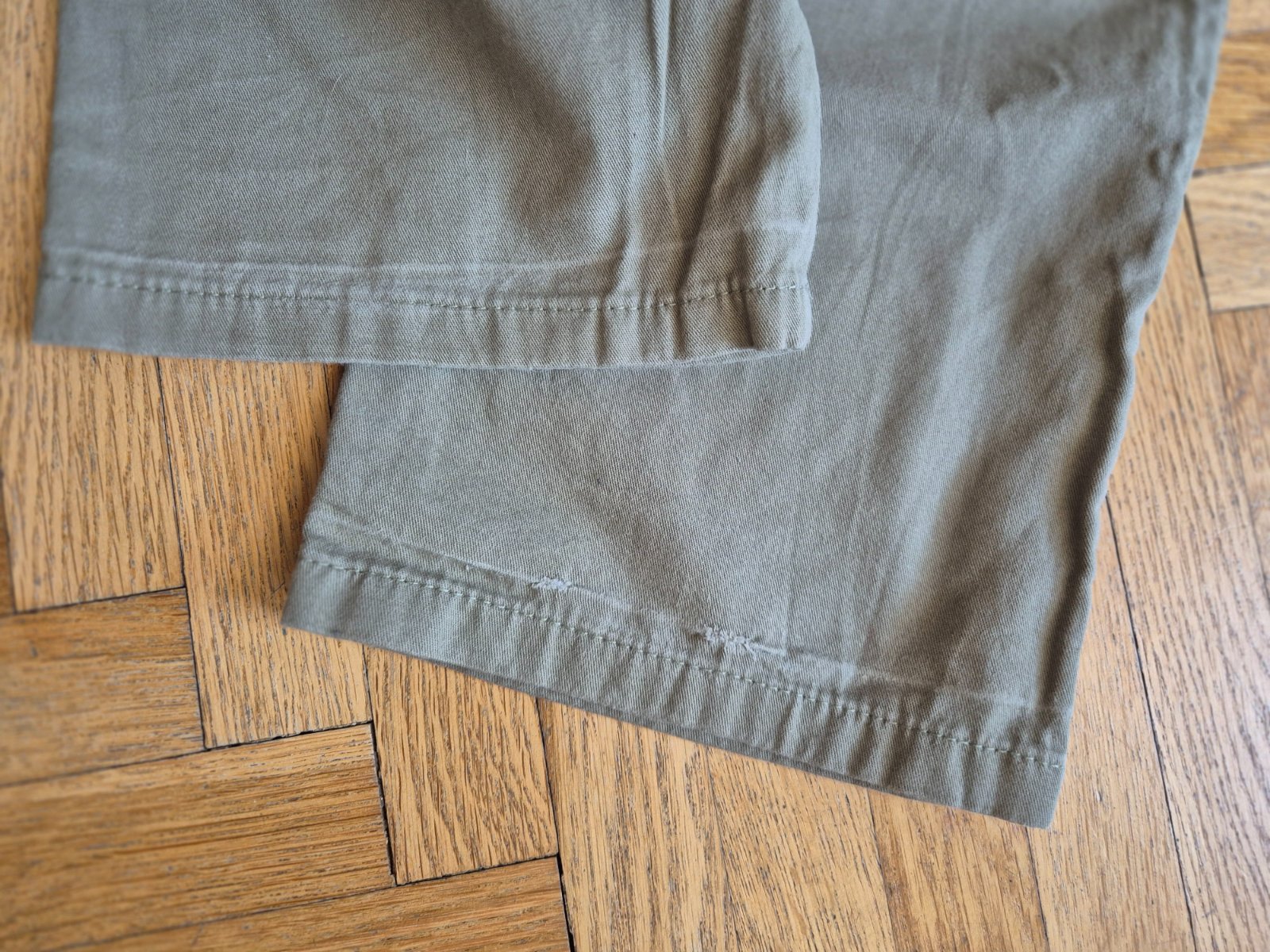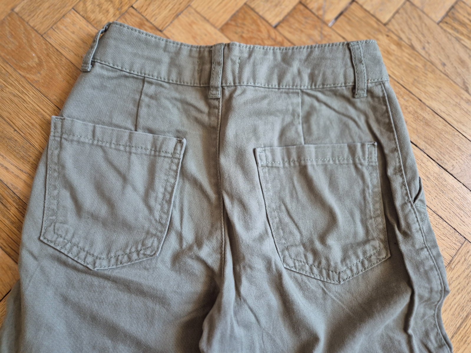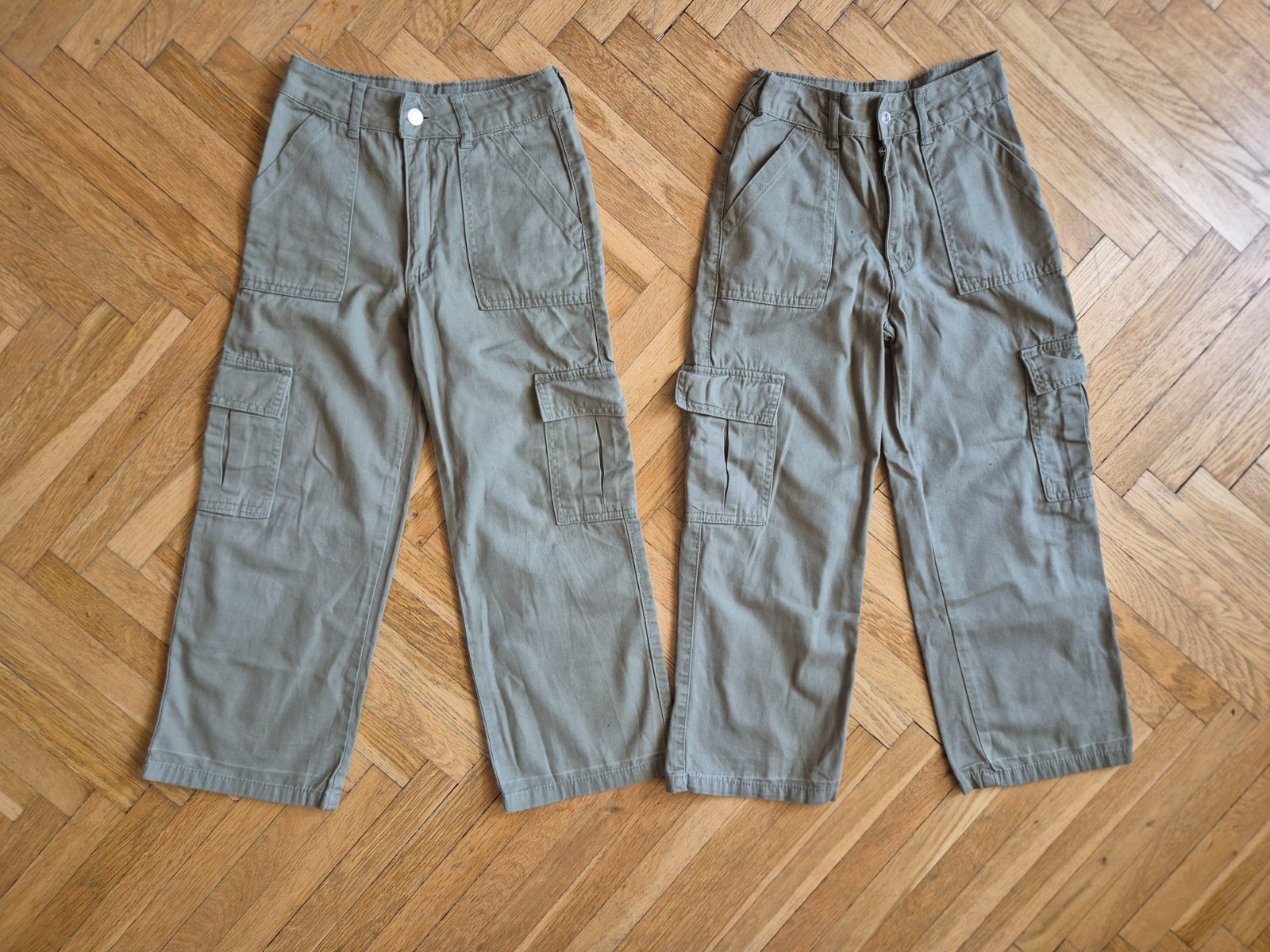 Kupované nové, zkracovala jsem nohavice a pak znovu popouštěla, je to na nich vidět (světlý vodorovný proužek asi 3 cm nad spodním lemem), na jedněch kalhotách prodřené (a zašité) viz foto, jinak ale stále moc pěkné